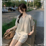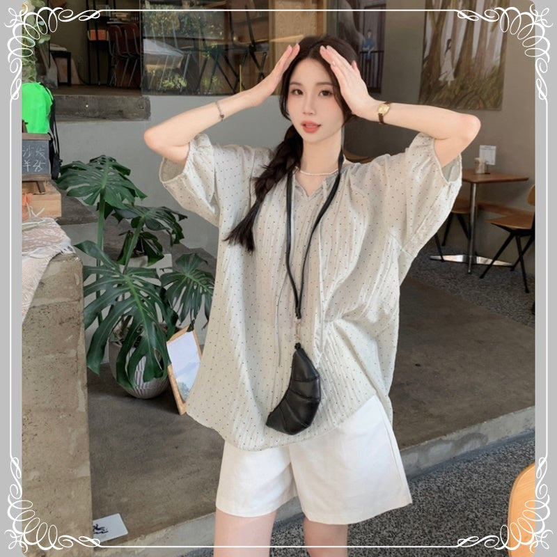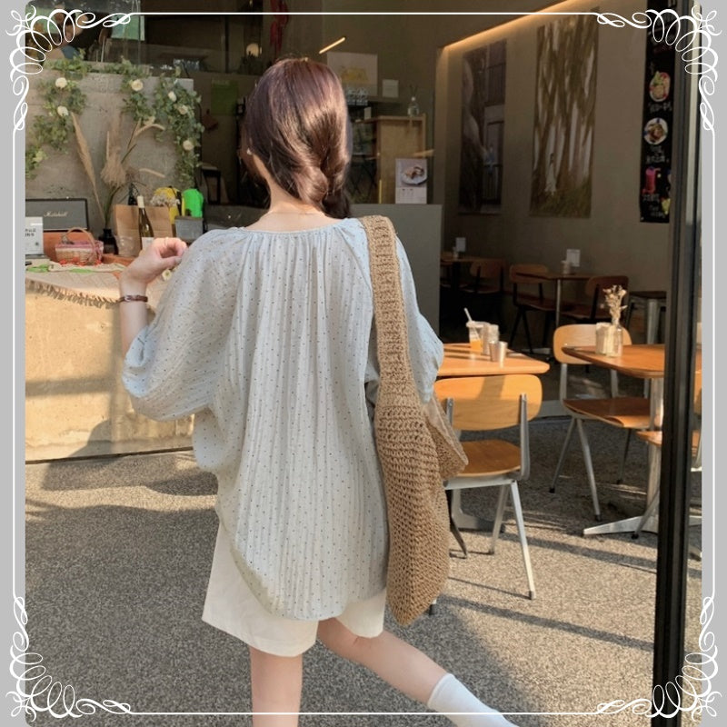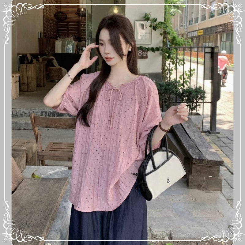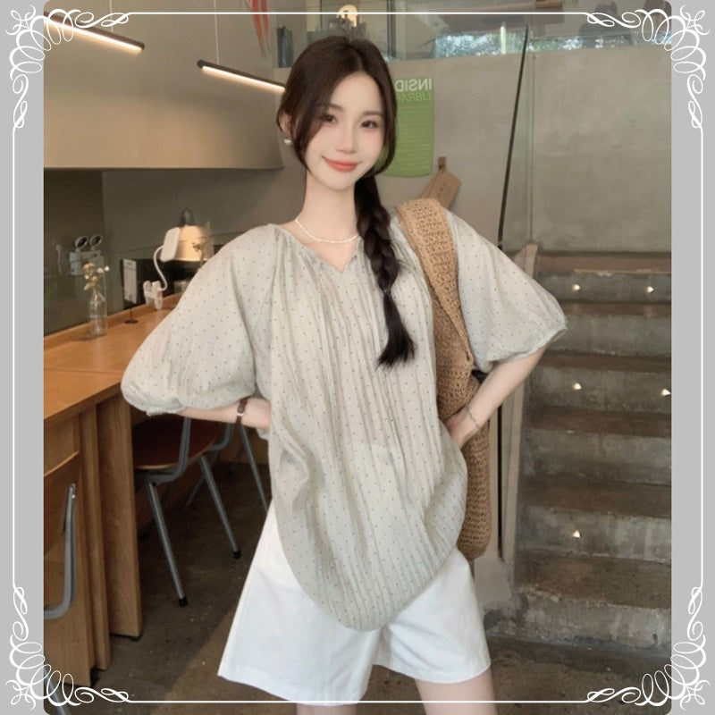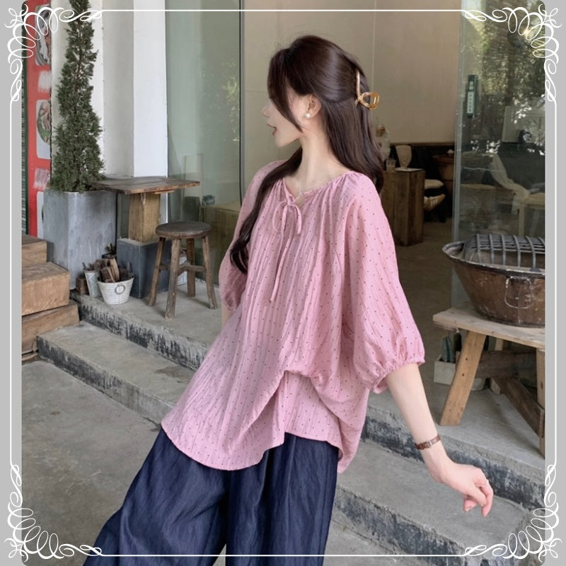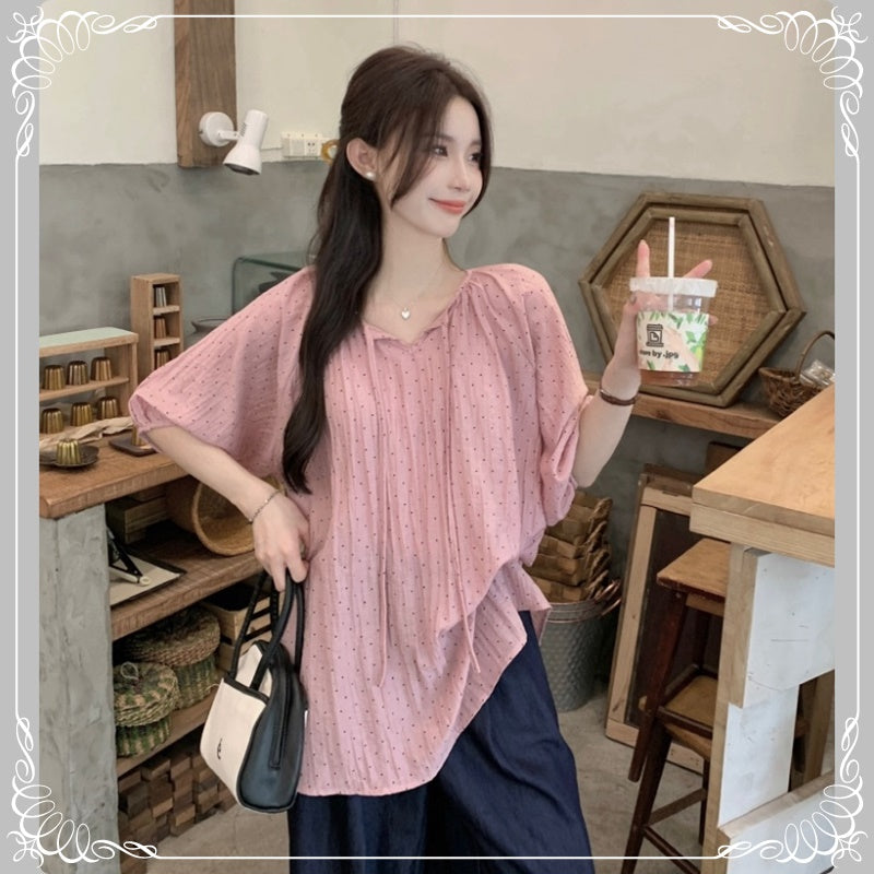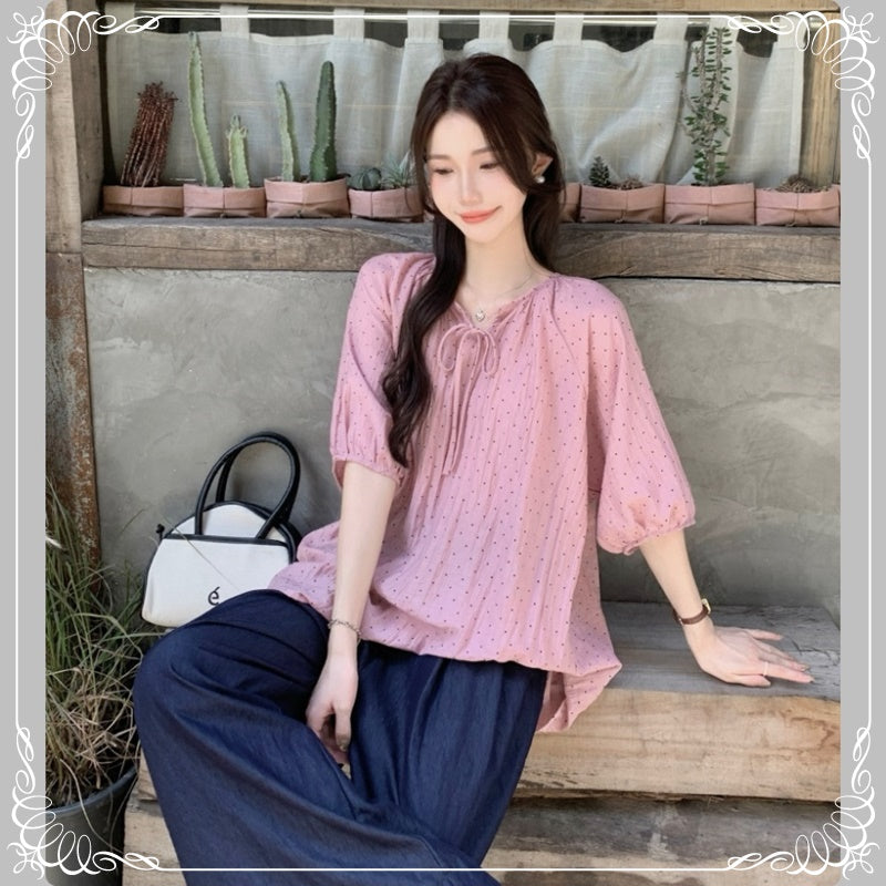 七分袖 V领 抽绳 波点