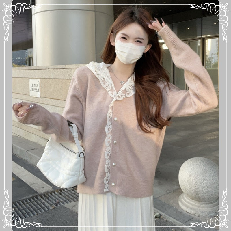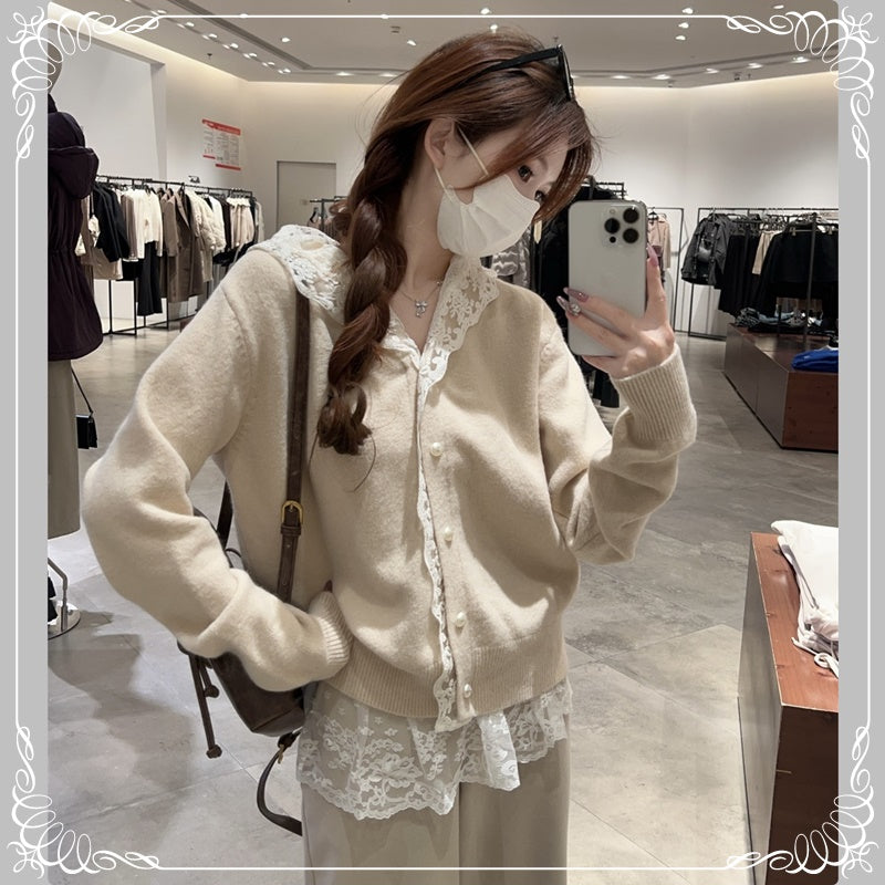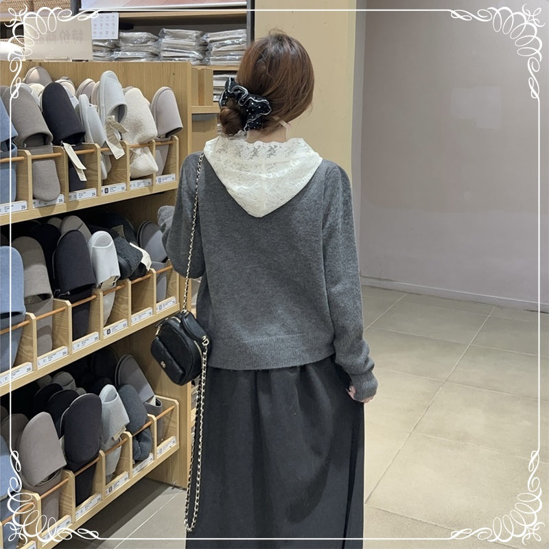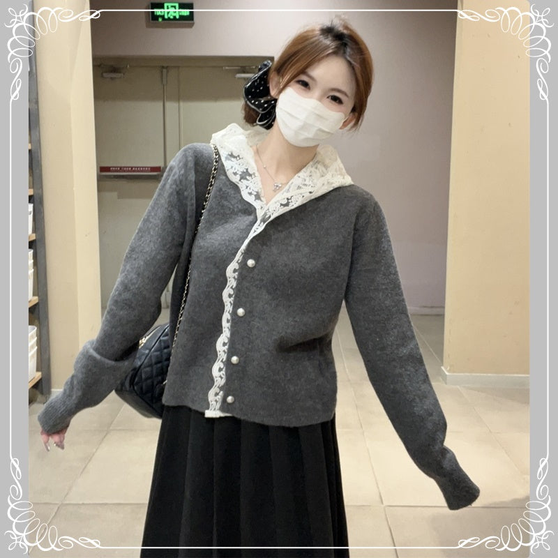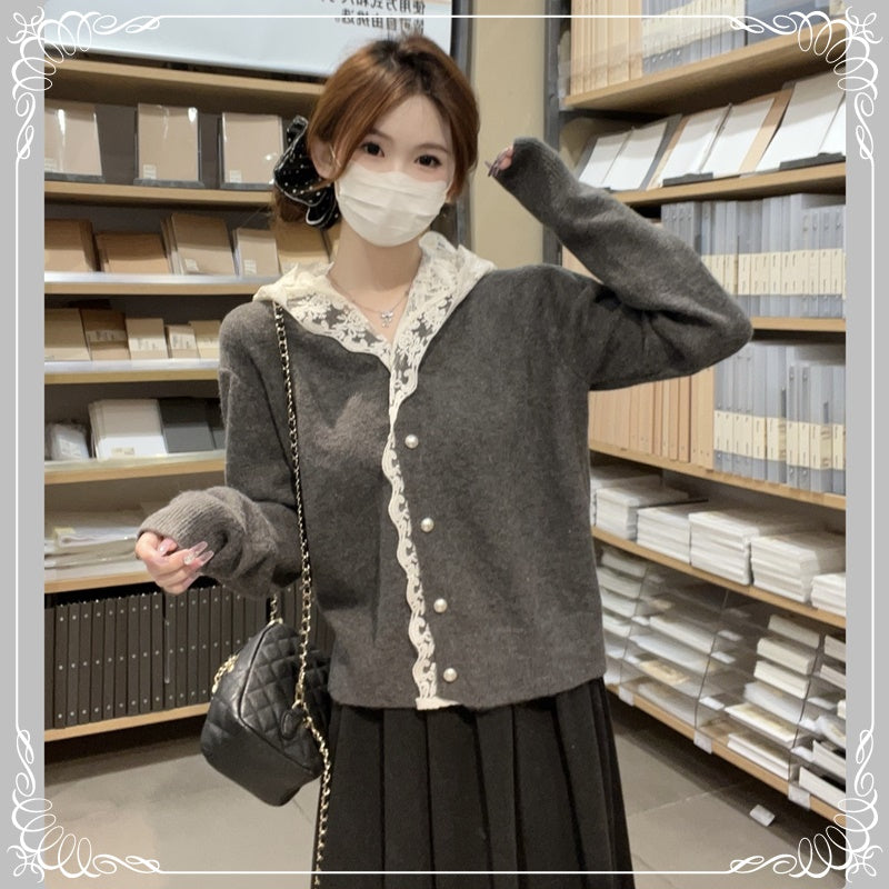 蕾丝 连帽 珍珠扣 开衫