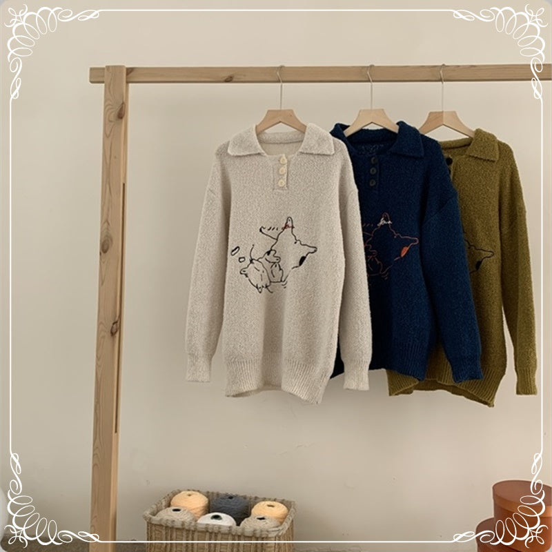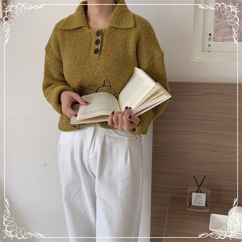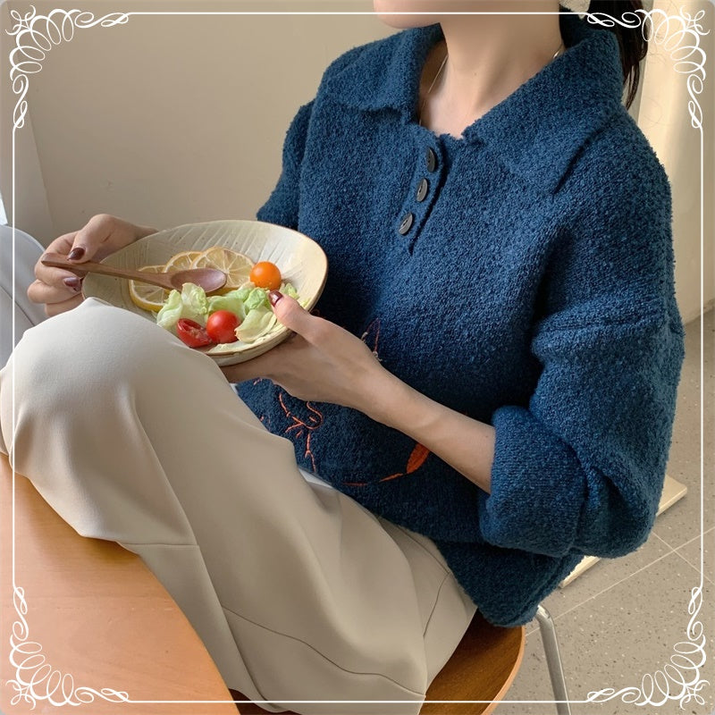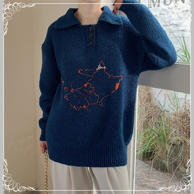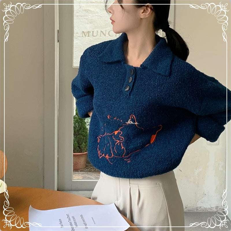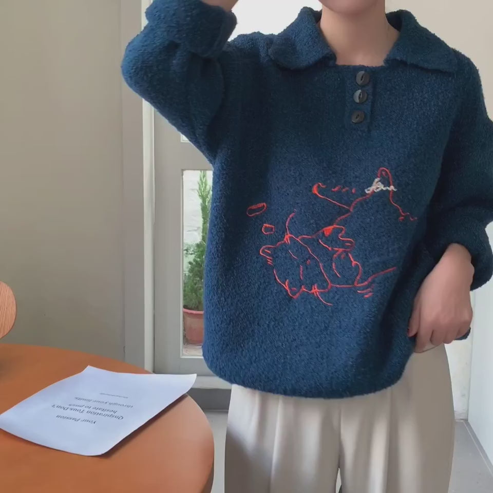 小猫刺绣 翻领 套头