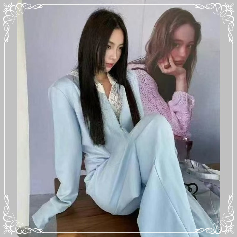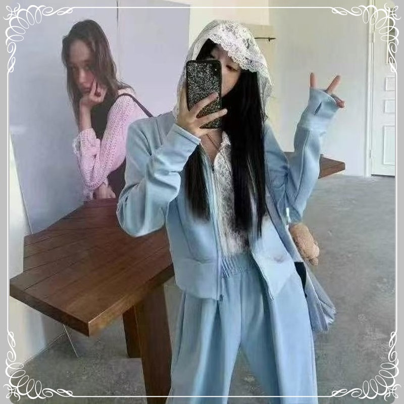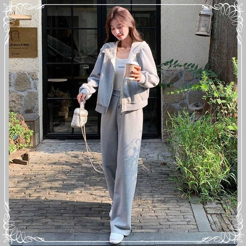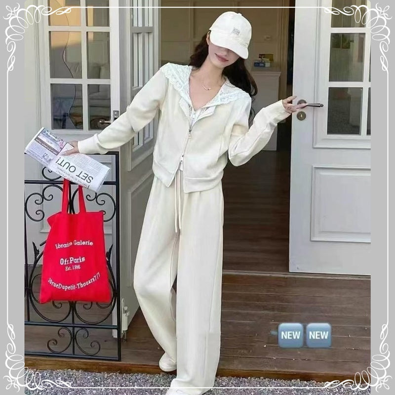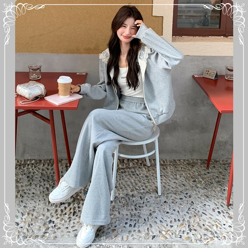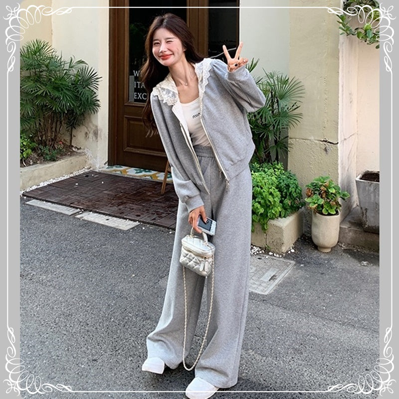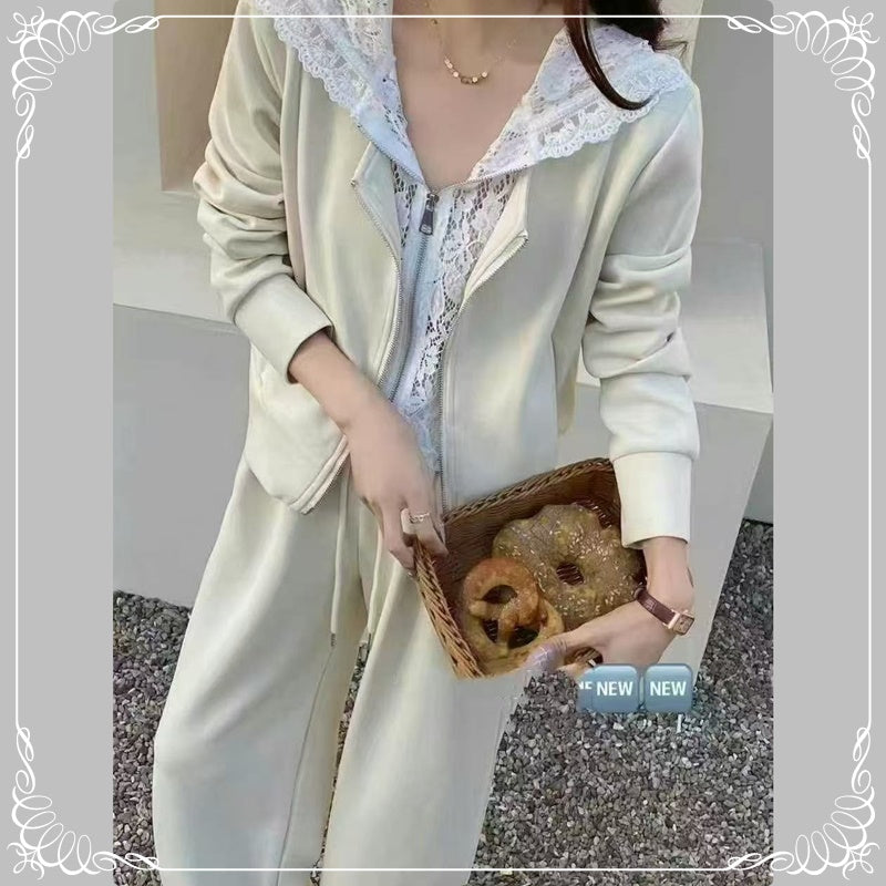 蕾丝拼接 连帽卫衣+阔腿裤 套装