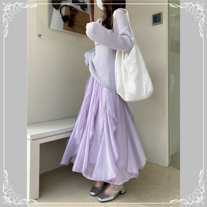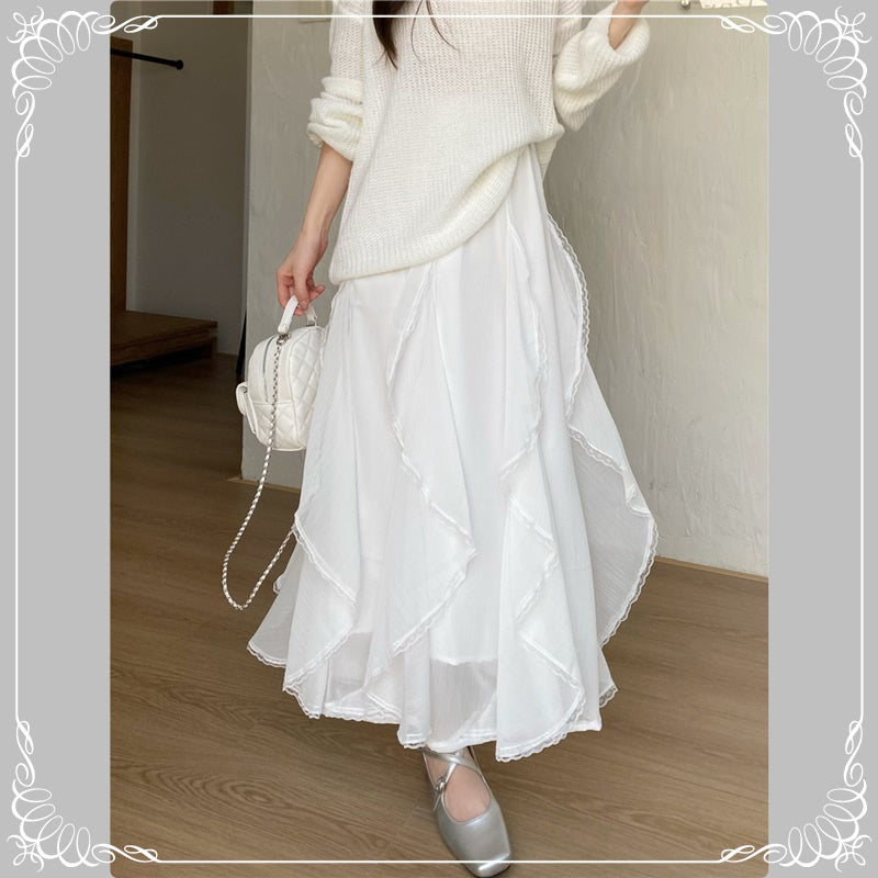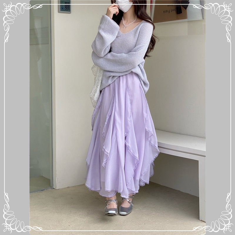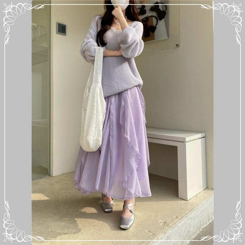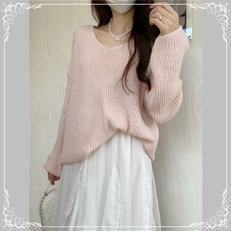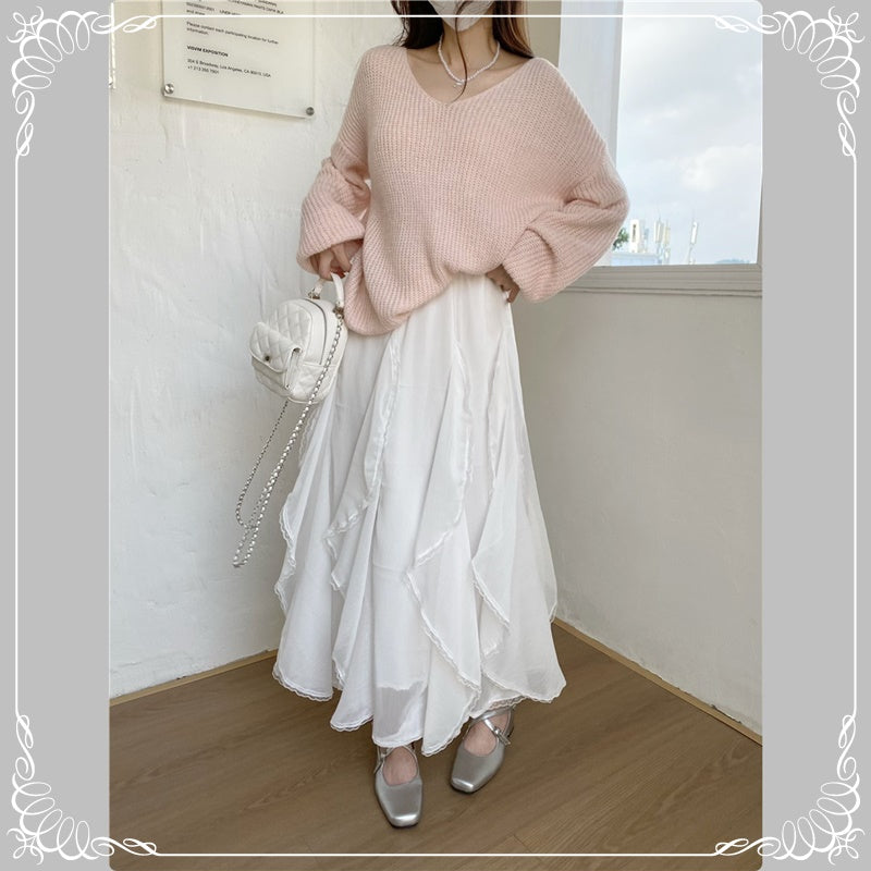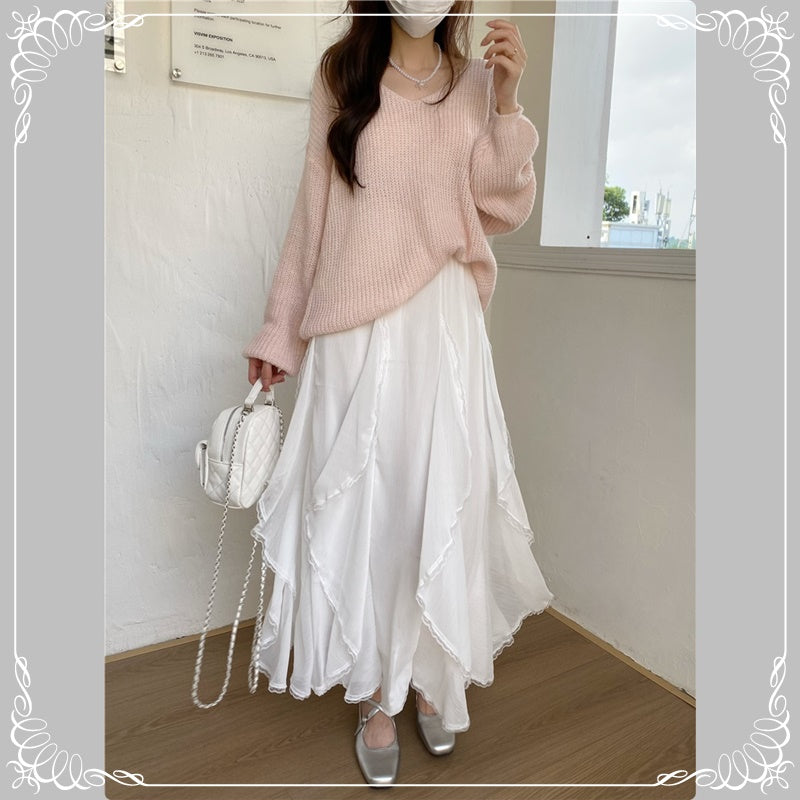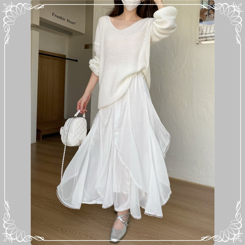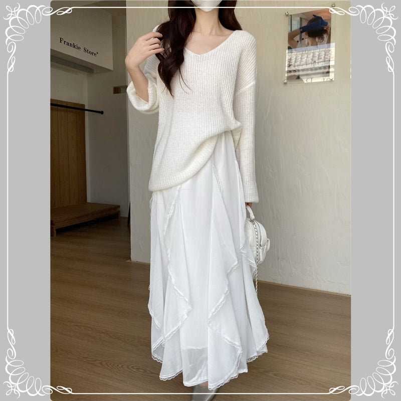 慵懒风V领套头毛衣+不规则蕾丝半身裙