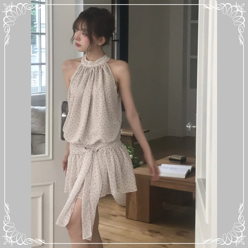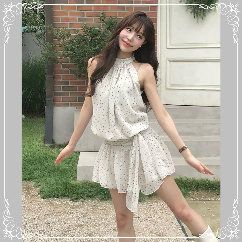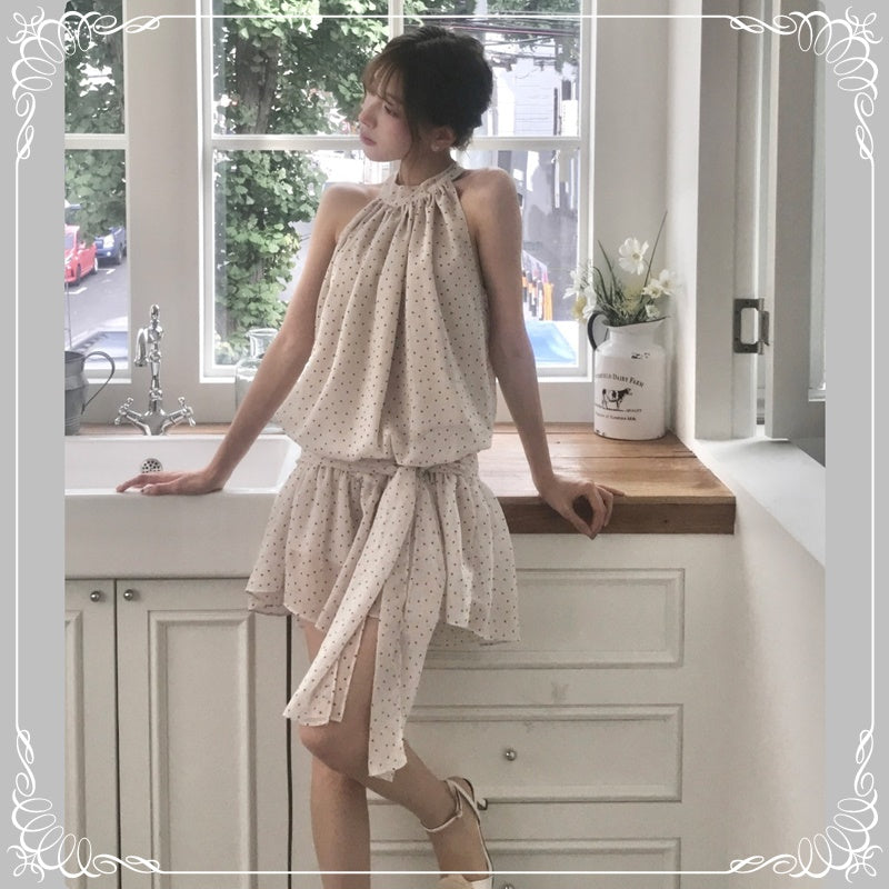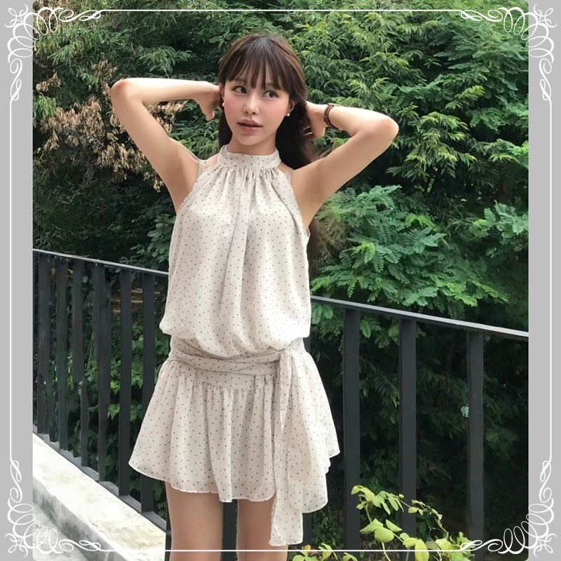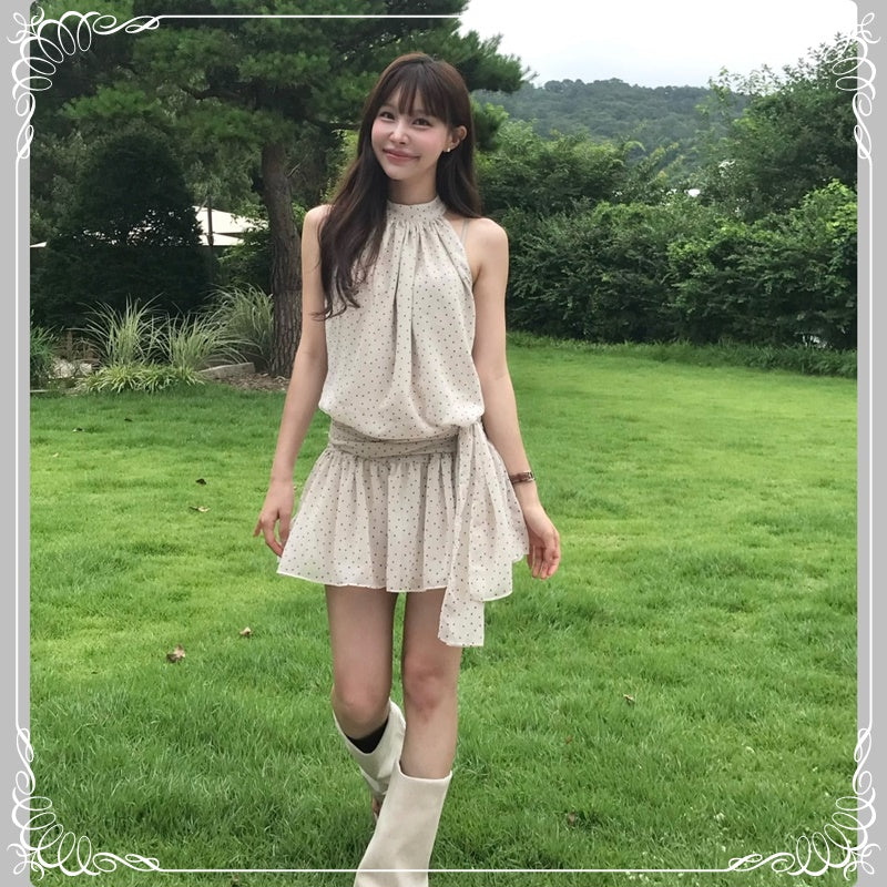 挂脖 绑带 无袖 波点