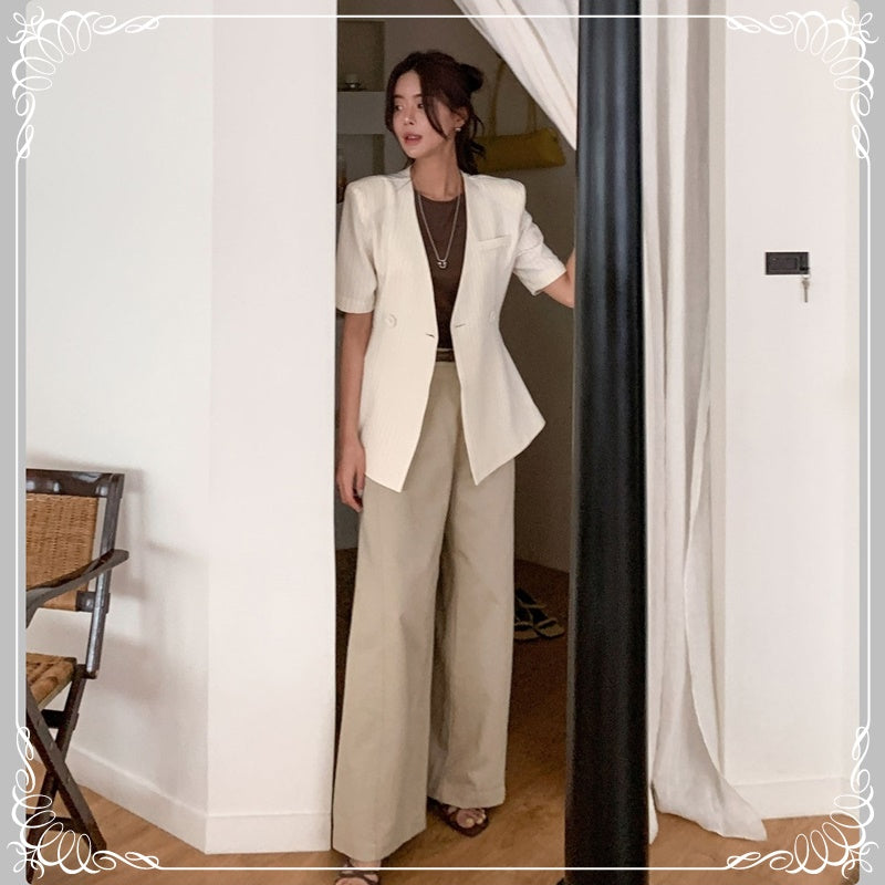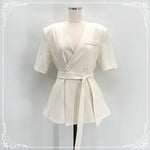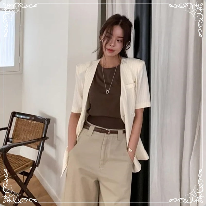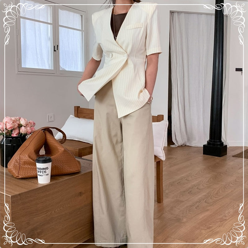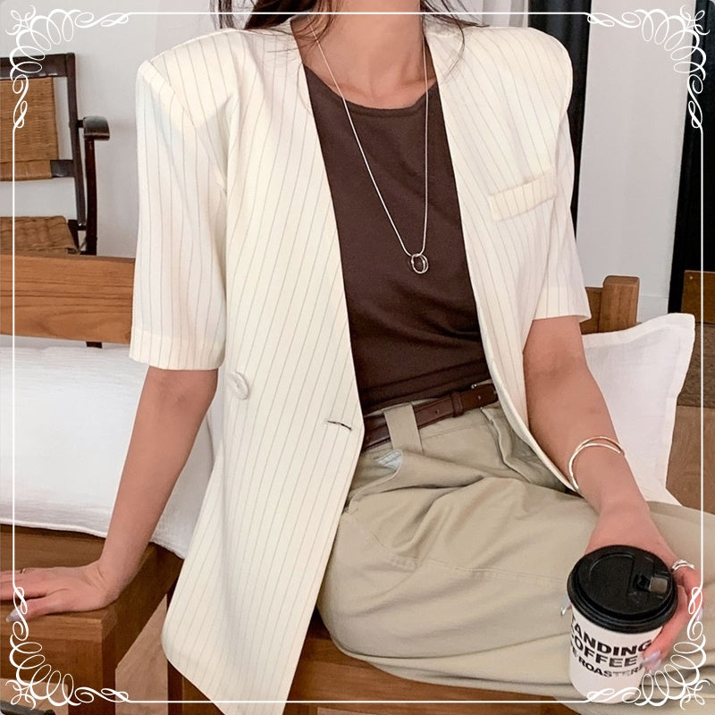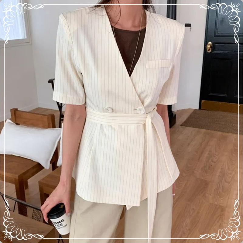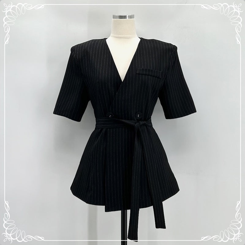 条纹 V领 绑带 短袖 西装上衣
