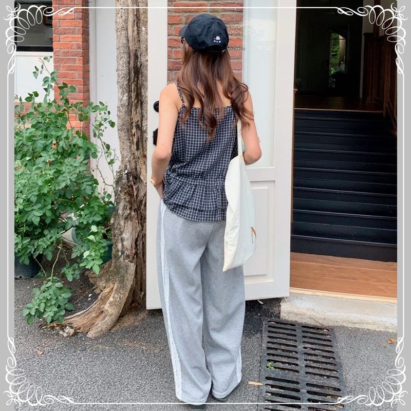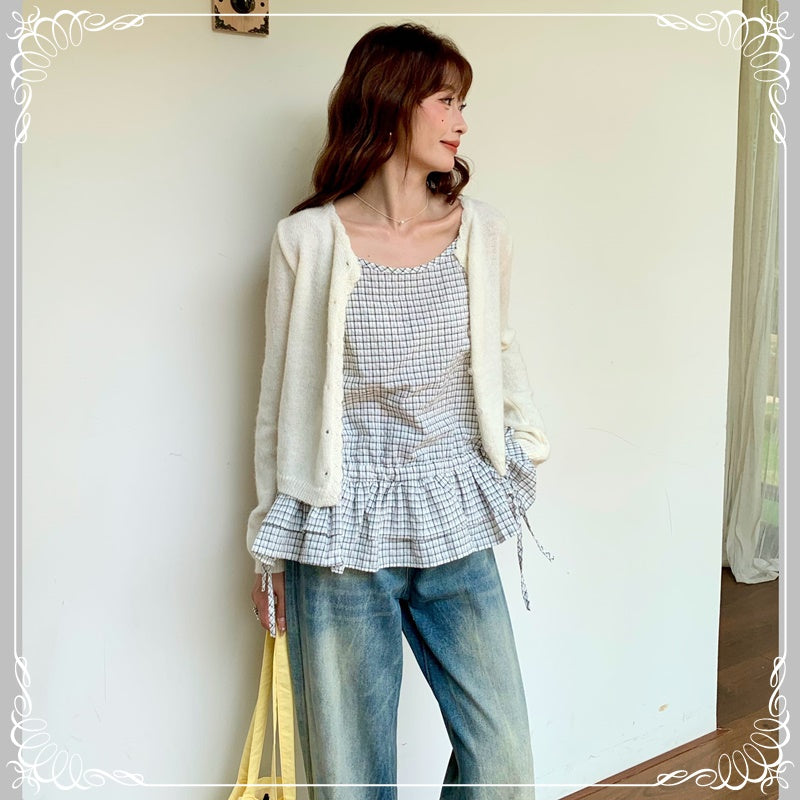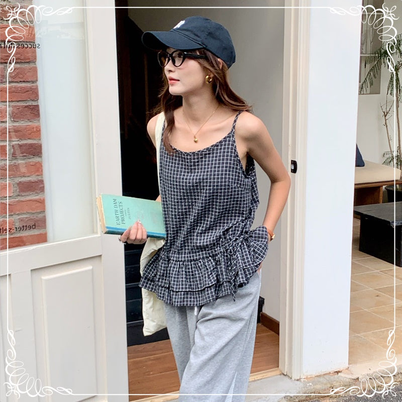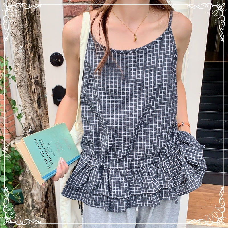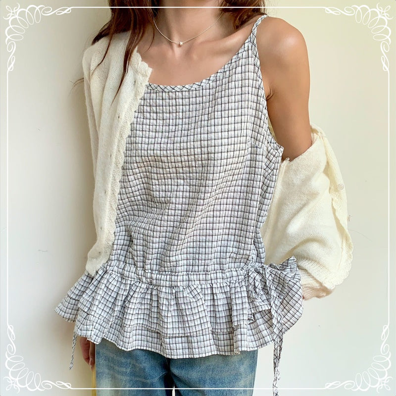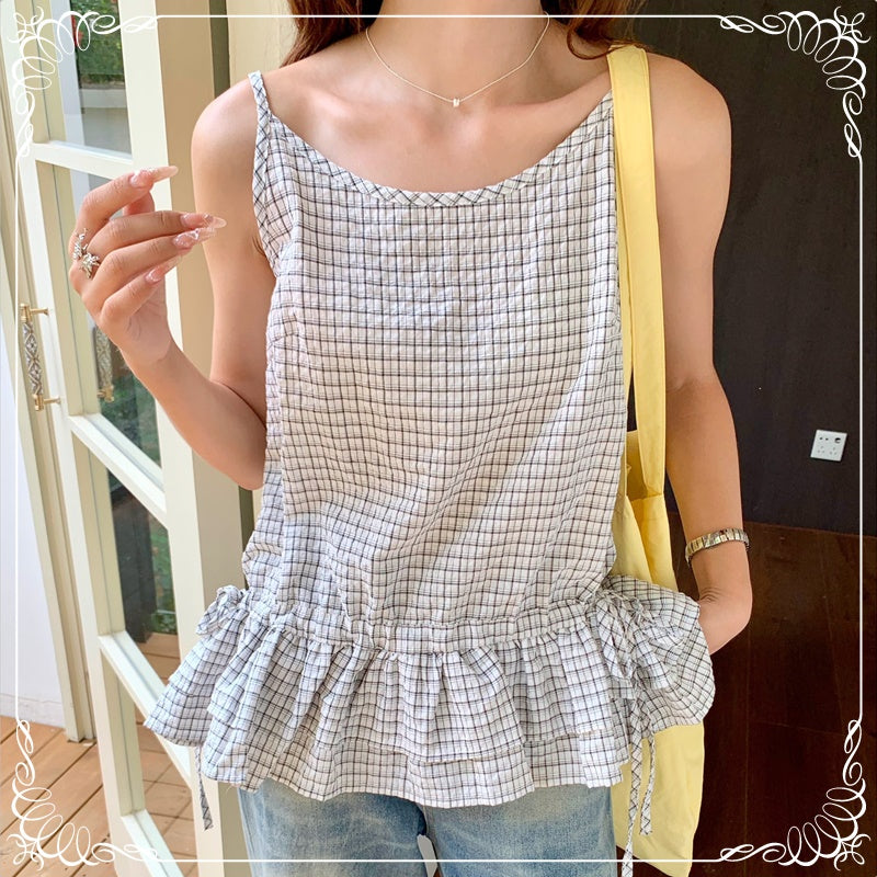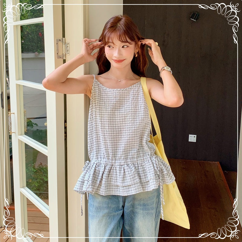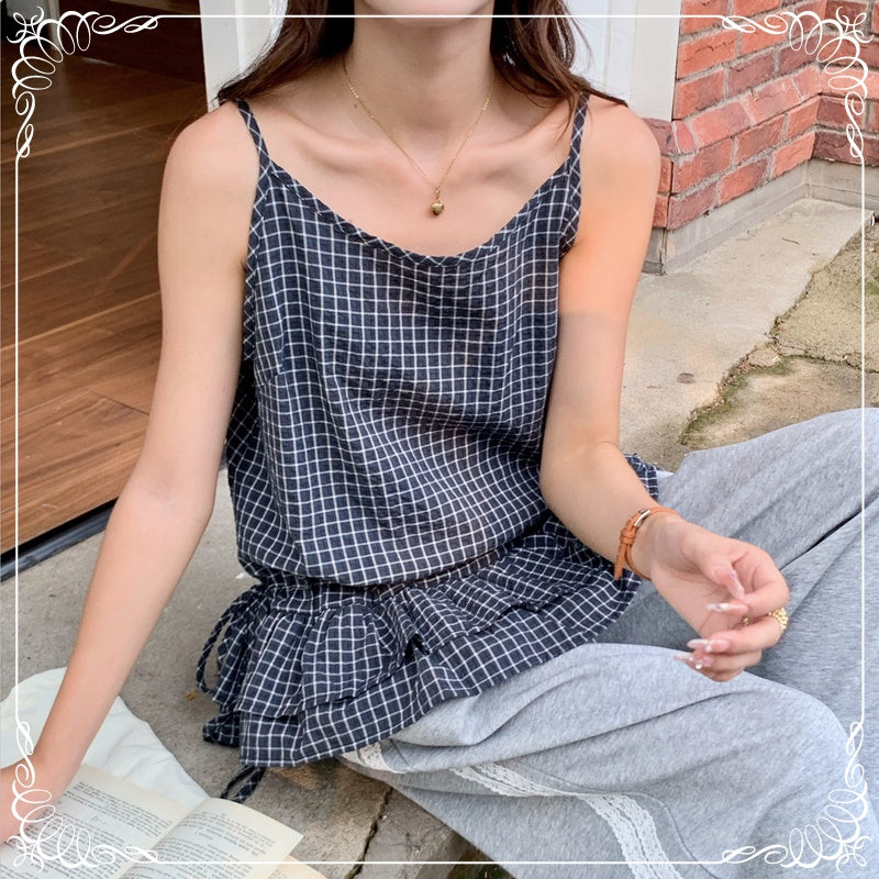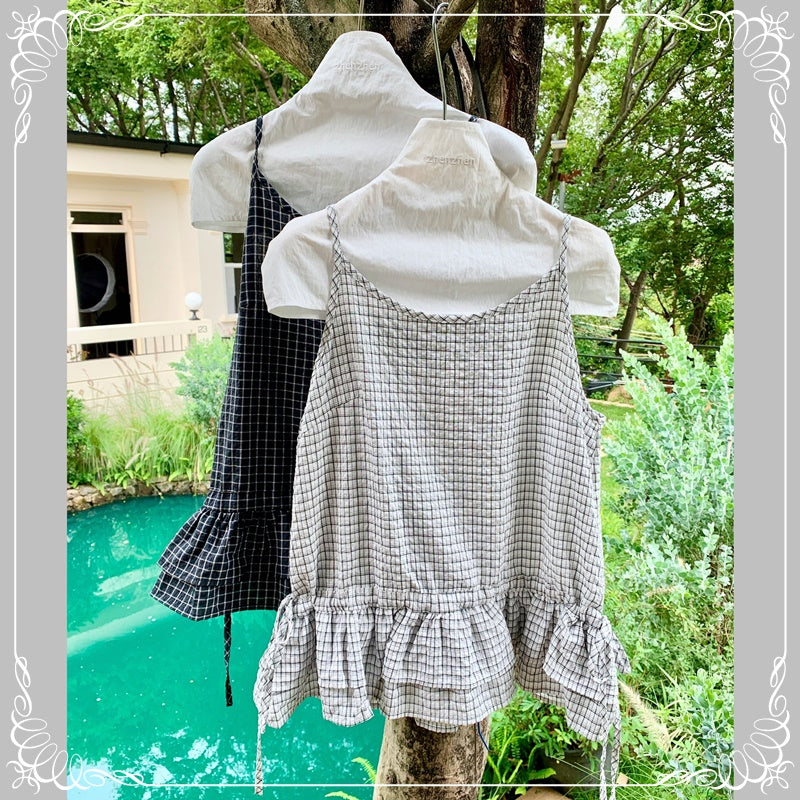 格纹 荷叶边 抽绳 吊带