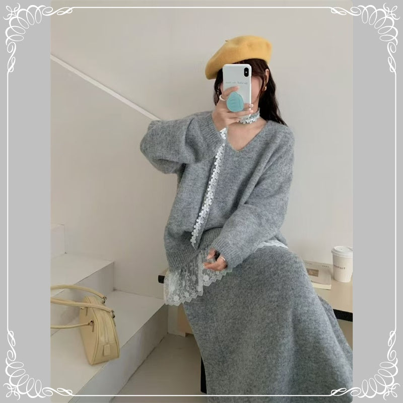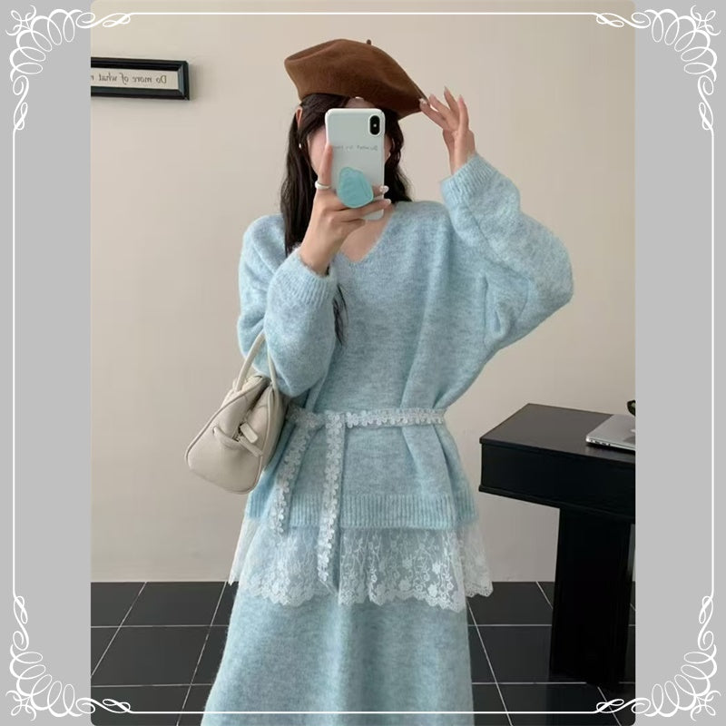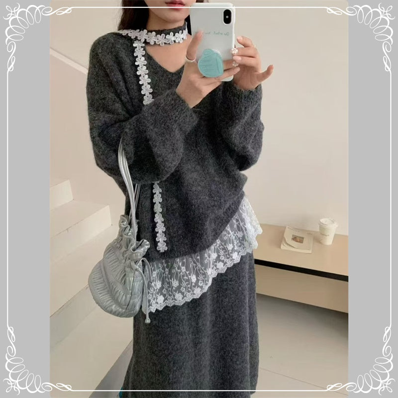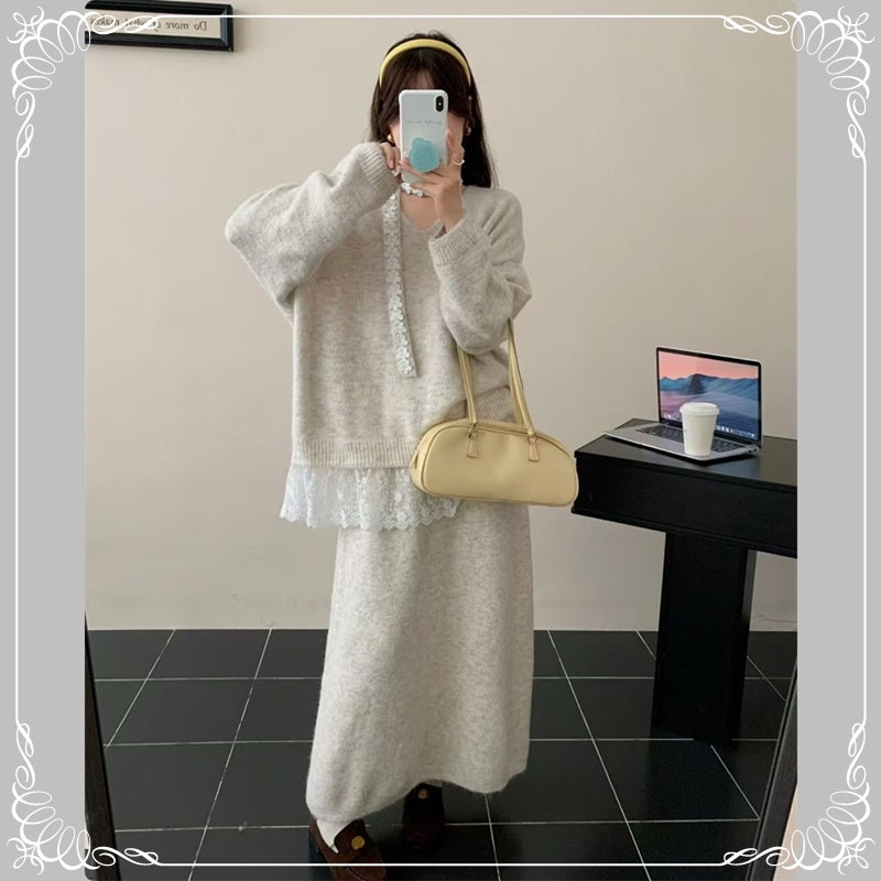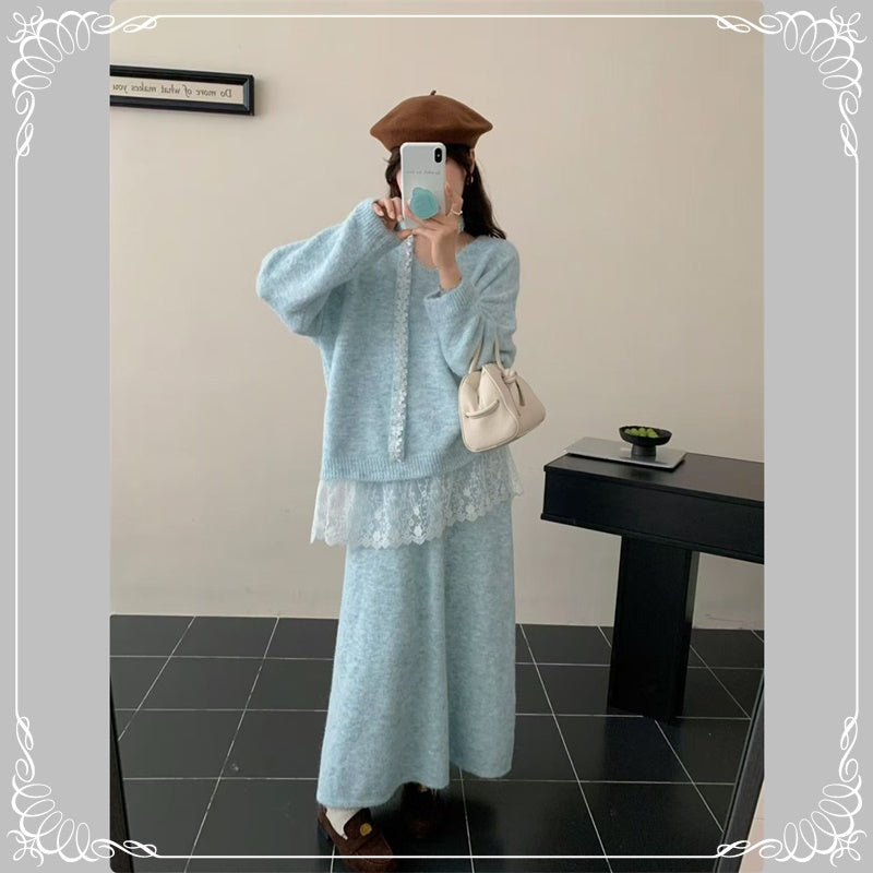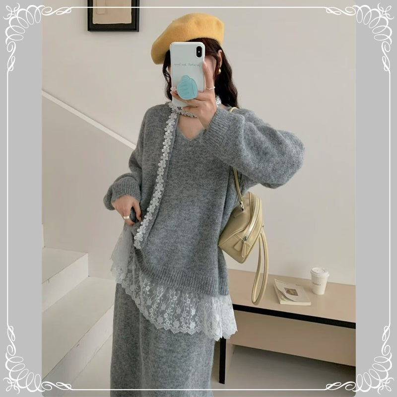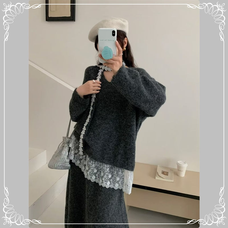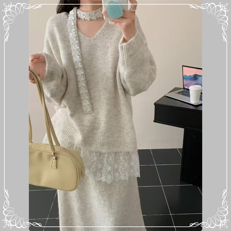 慵懒风 蕾丝拼接 上衣+半身裙 毛衣套装