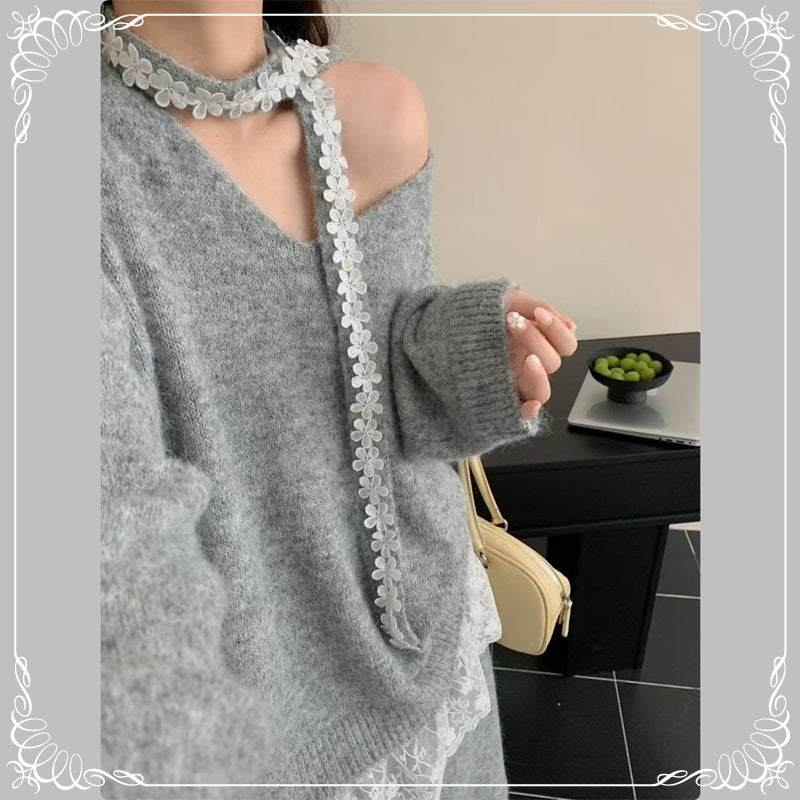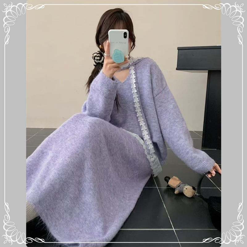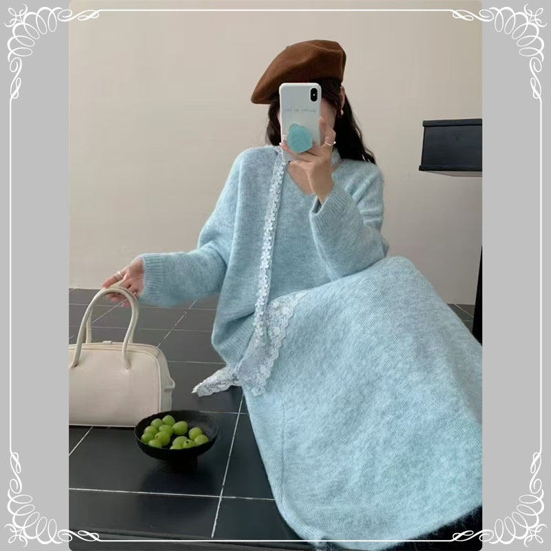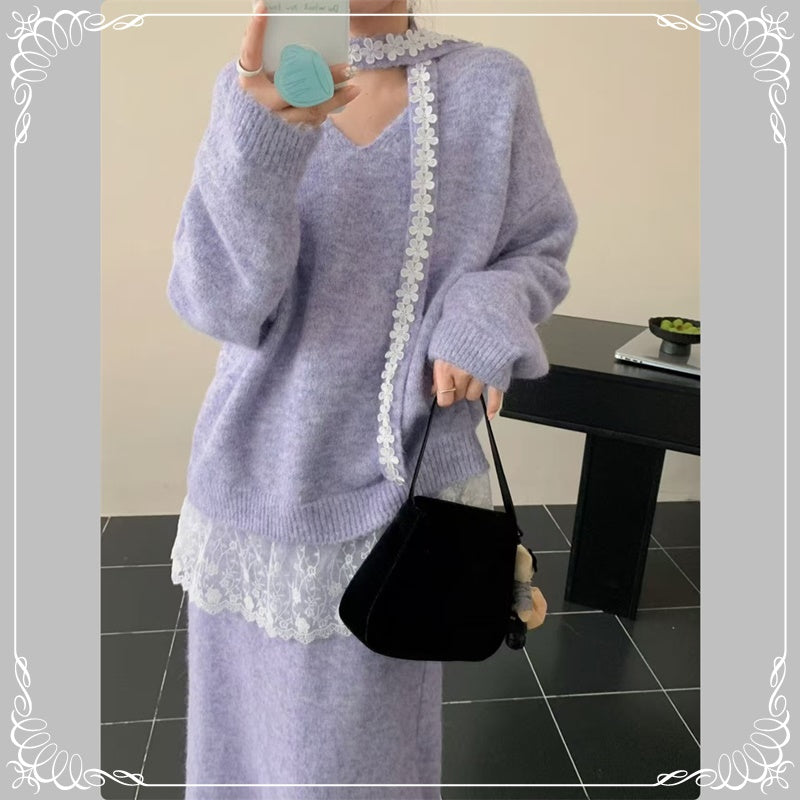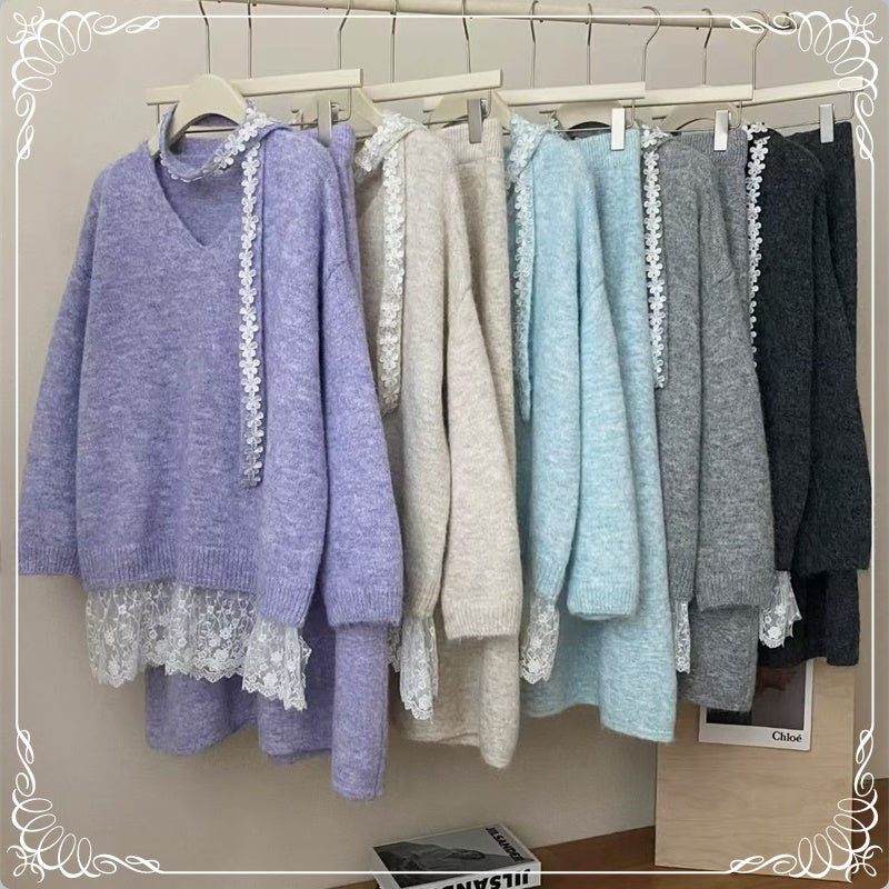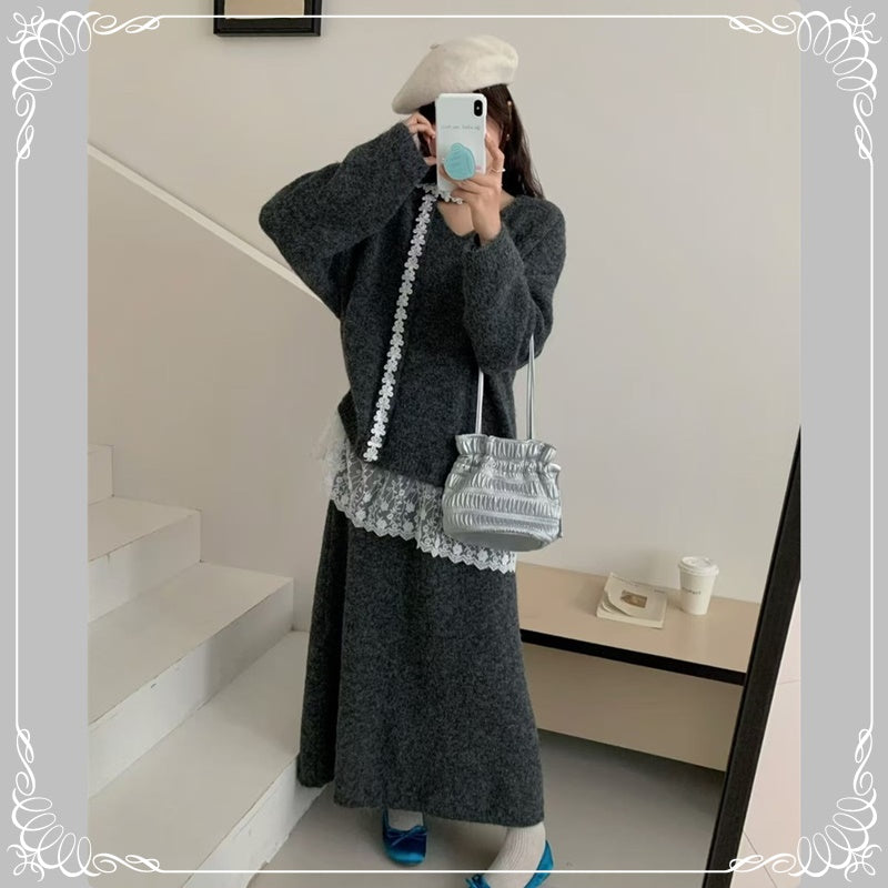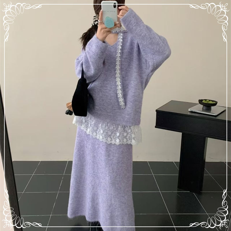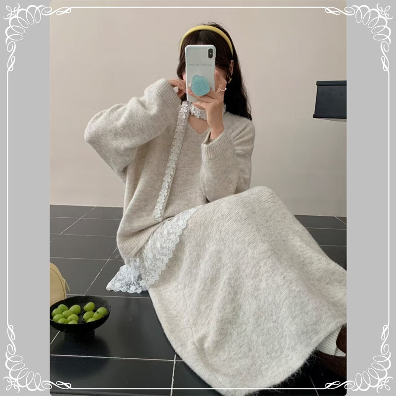 慵懒风 蕾丝拼接 上衣+半身裙 毛衣套装