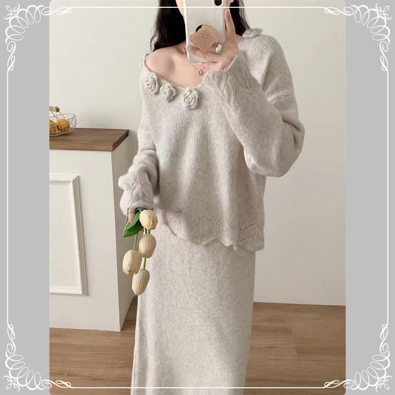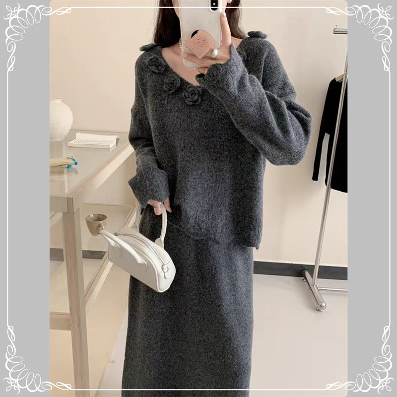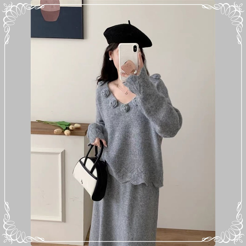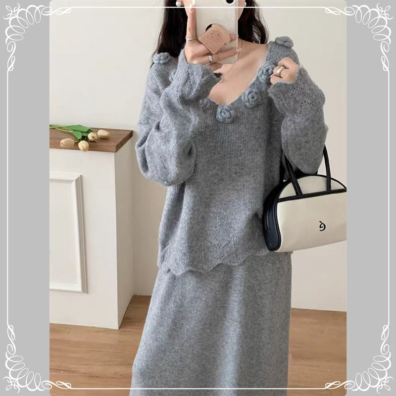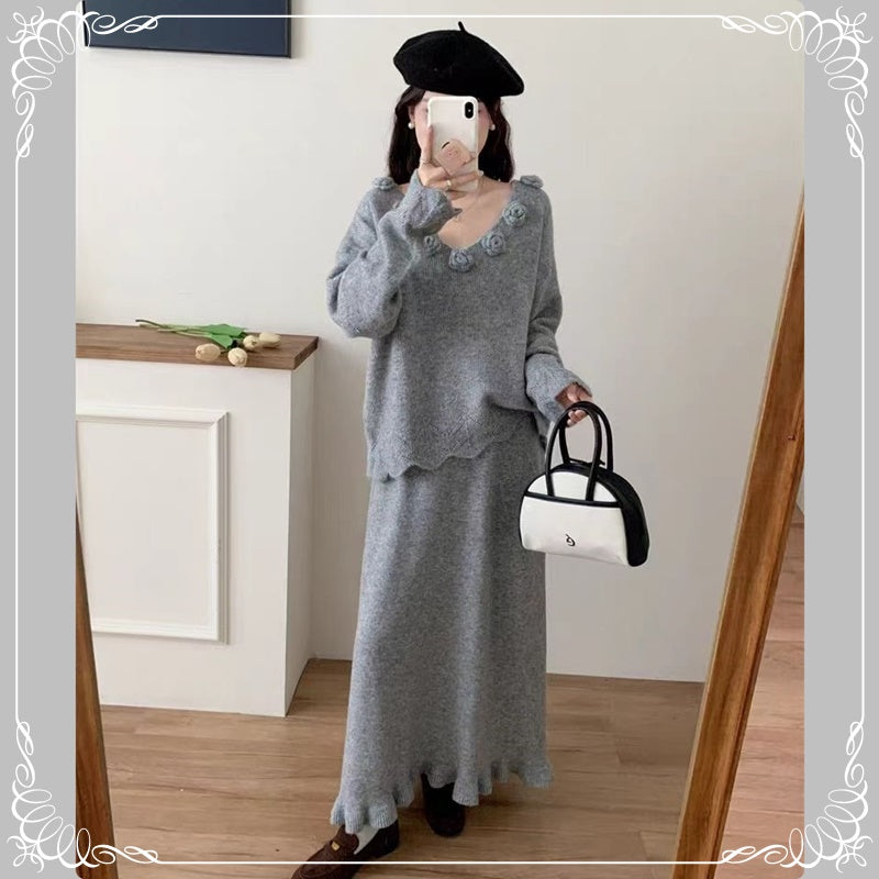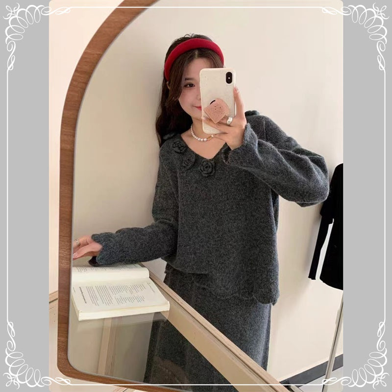 立体花朵 V领毛衣+高腰半身裙 毛衣套装