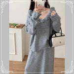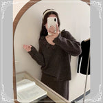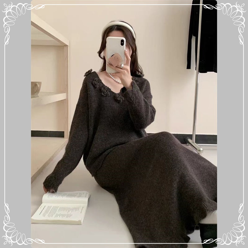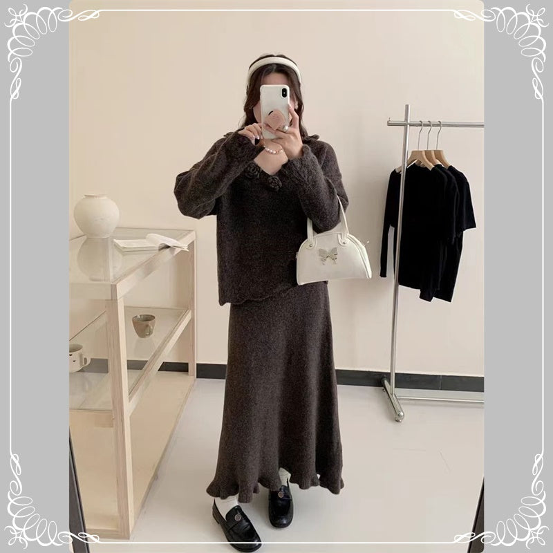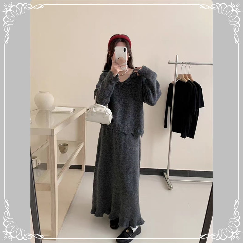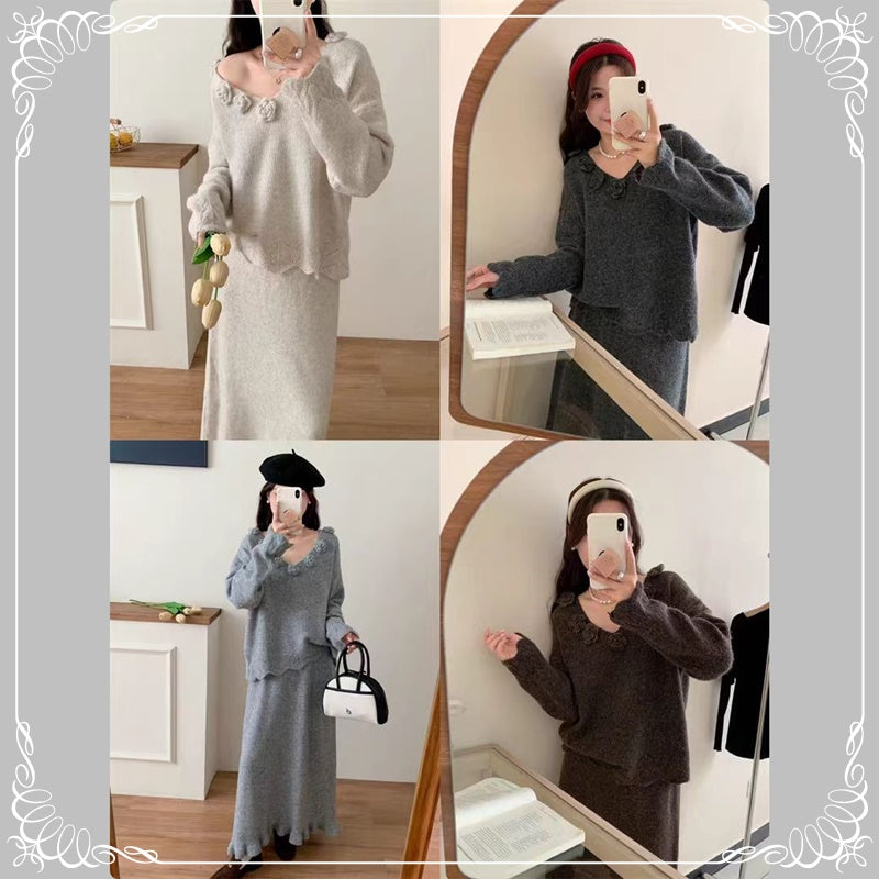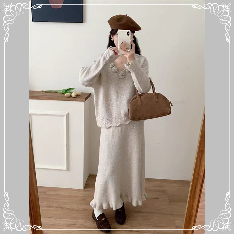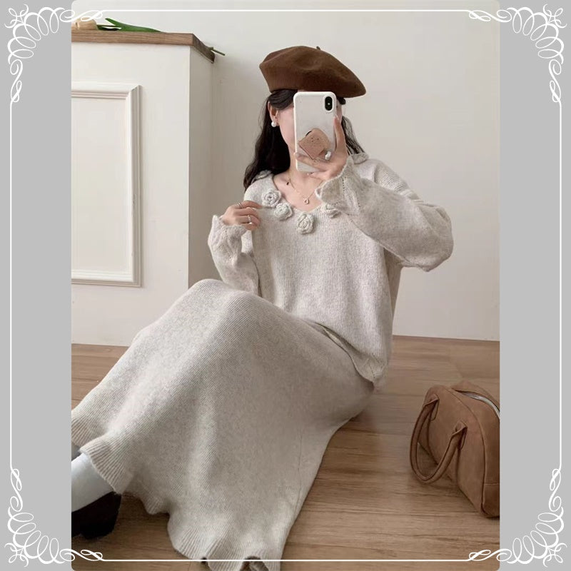 立体花朵 V领毛衣+高腰半身裙 毛衣套装