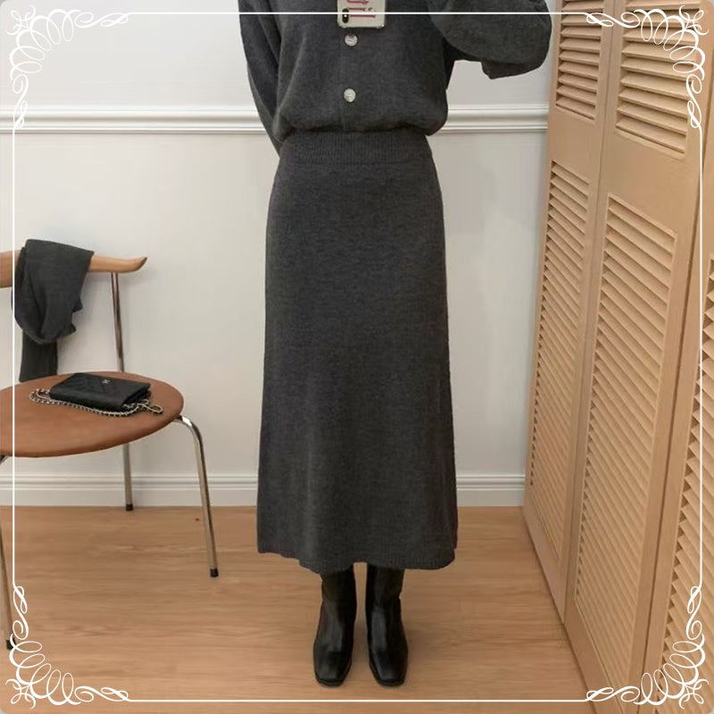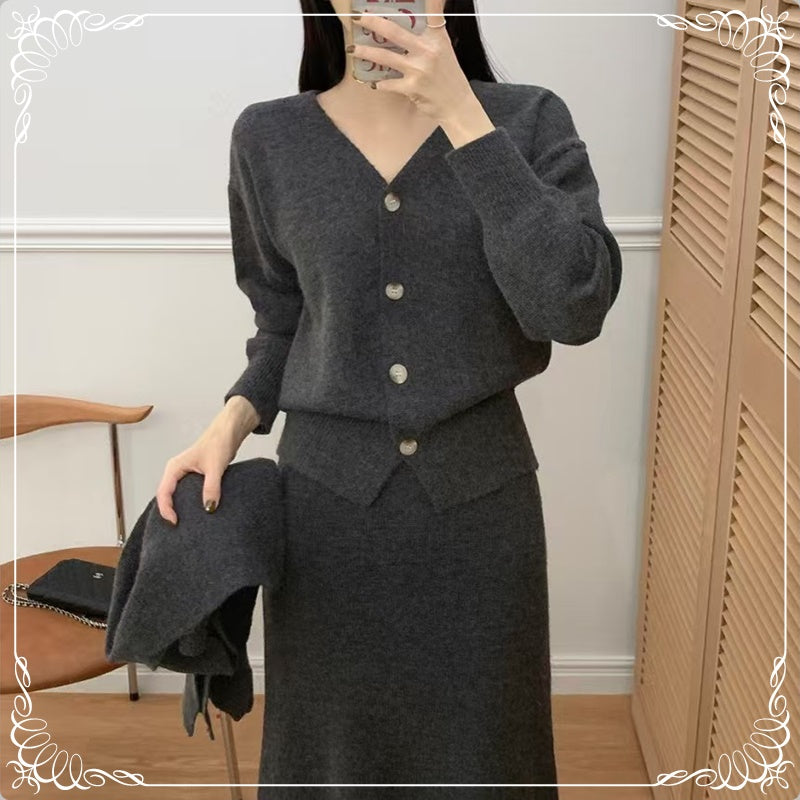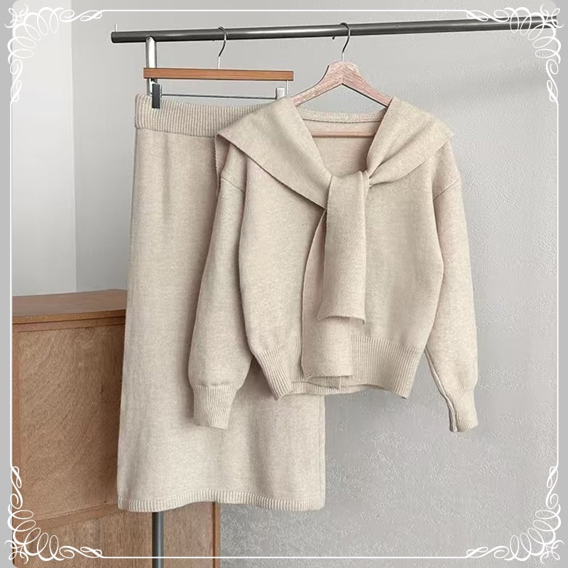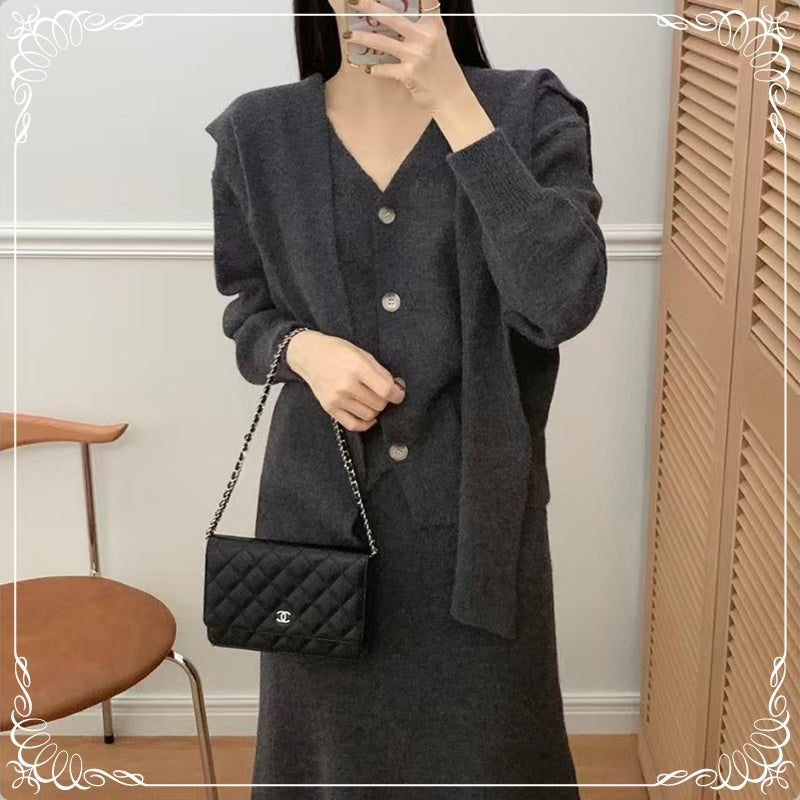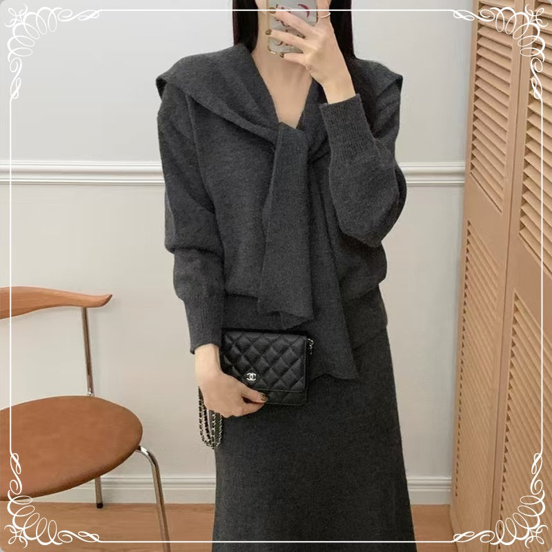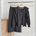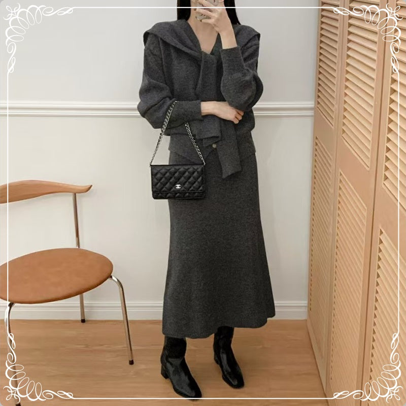 围巾 V领开衫 半裙 三件套套装