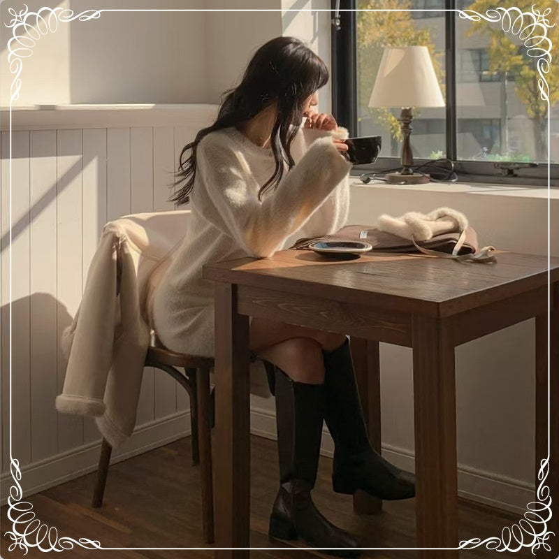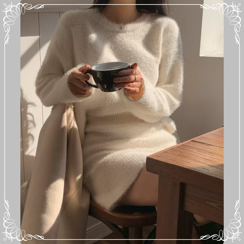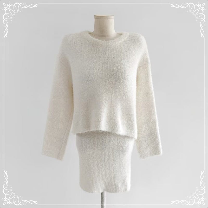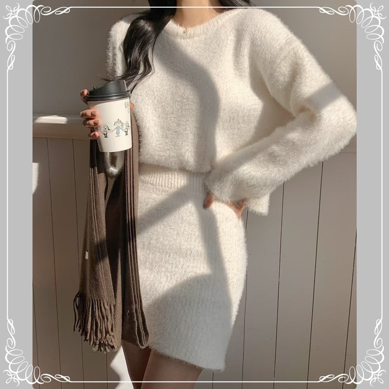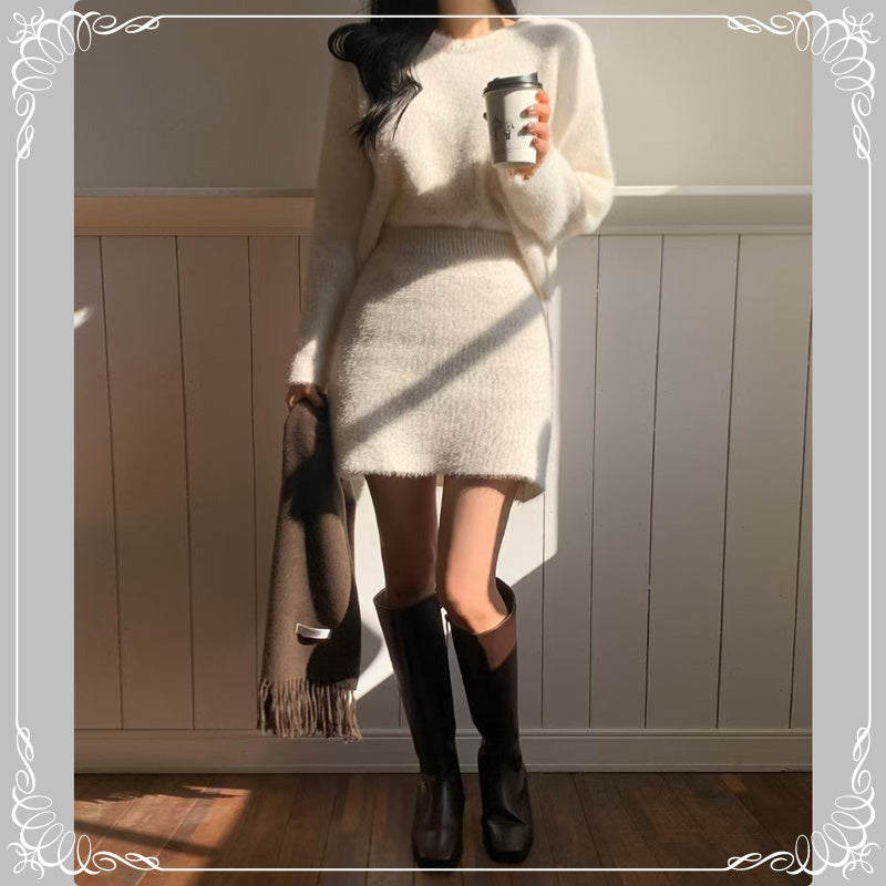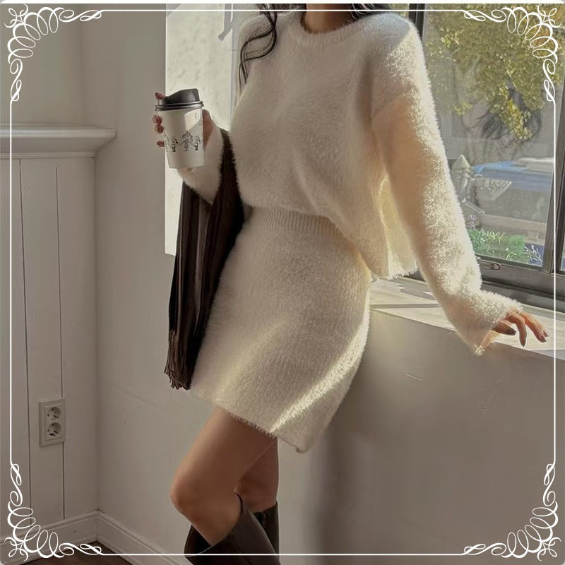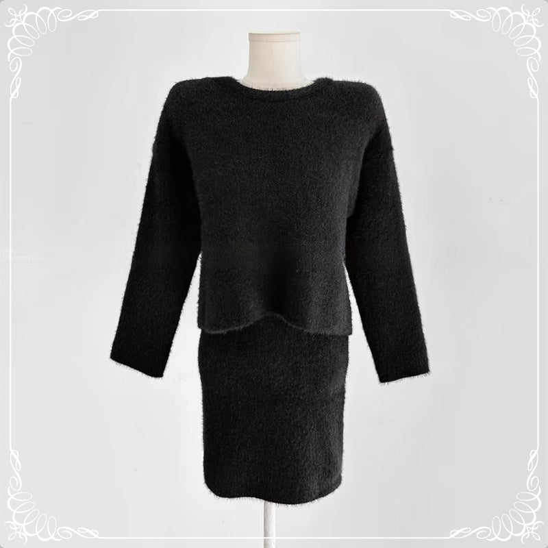 水貂毛 圆领 套头毛衣+短裙 套装