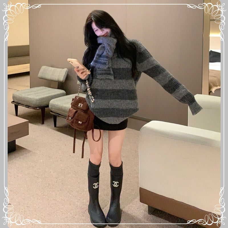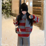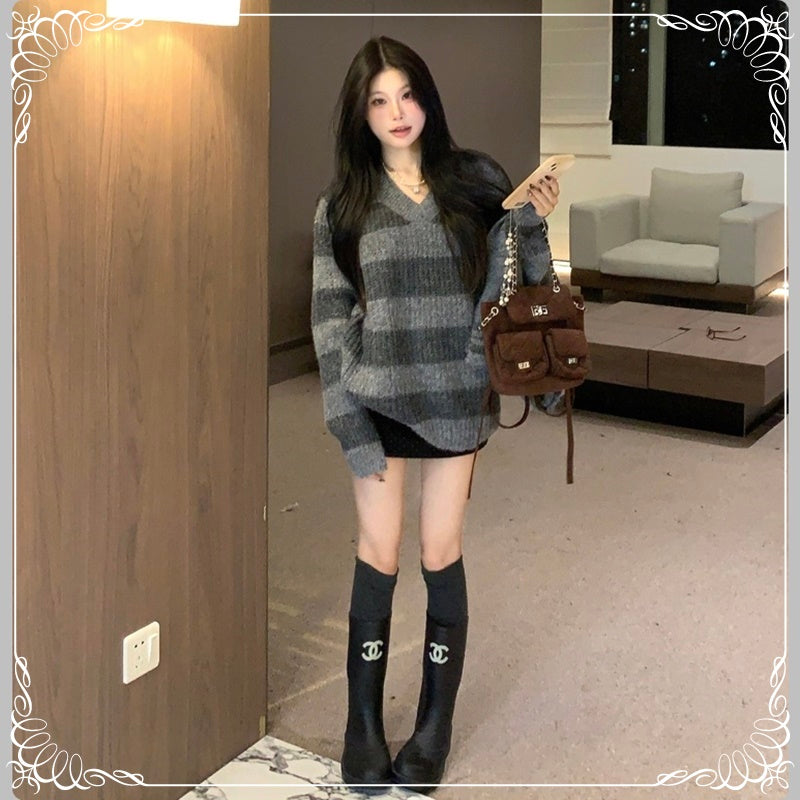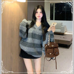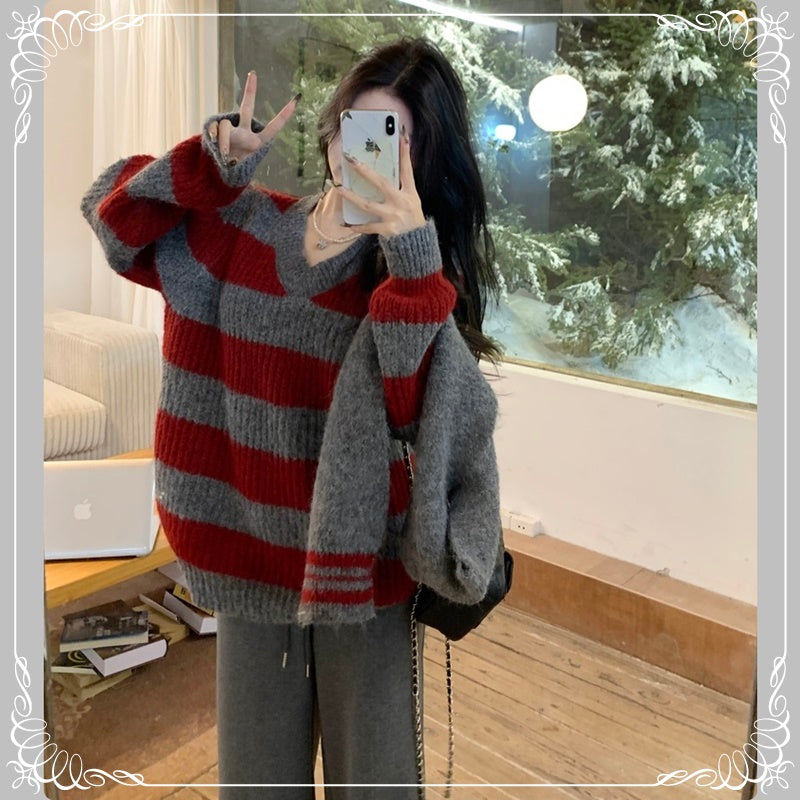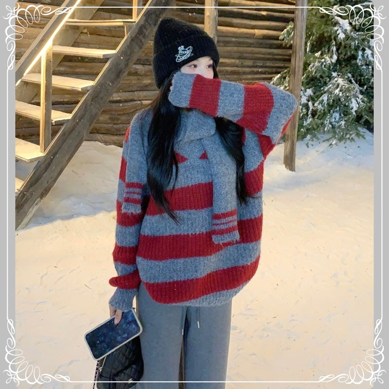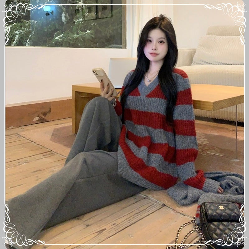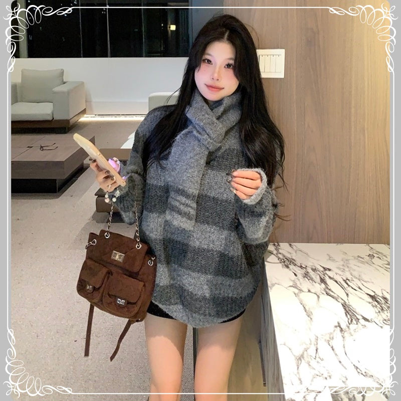 慵懒风 V领 条纹 套头毛衣+围巾 两件套 套装