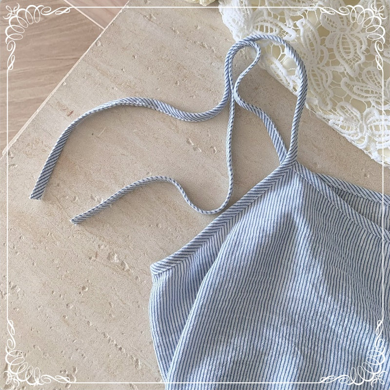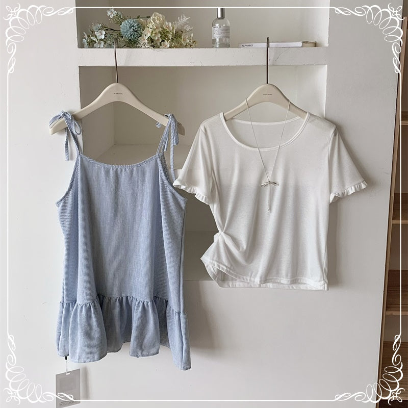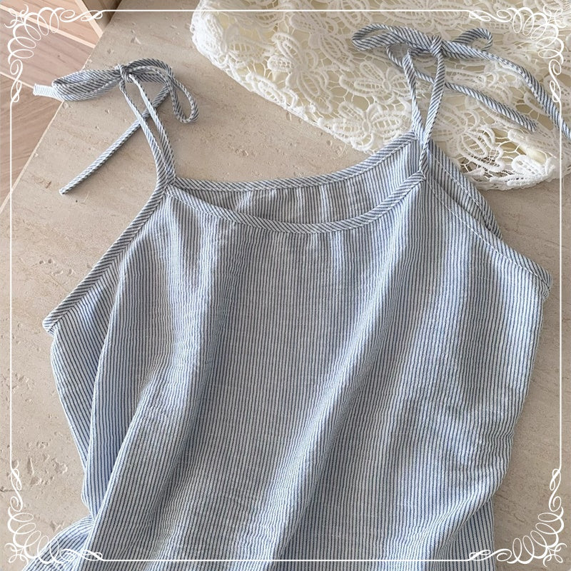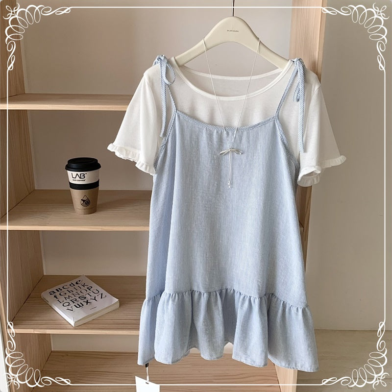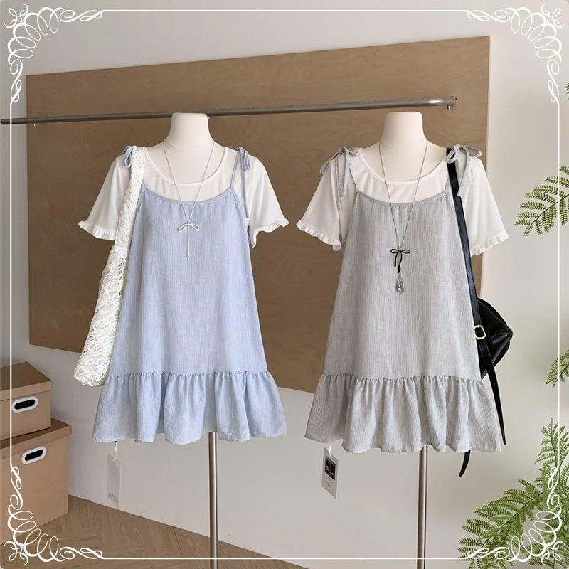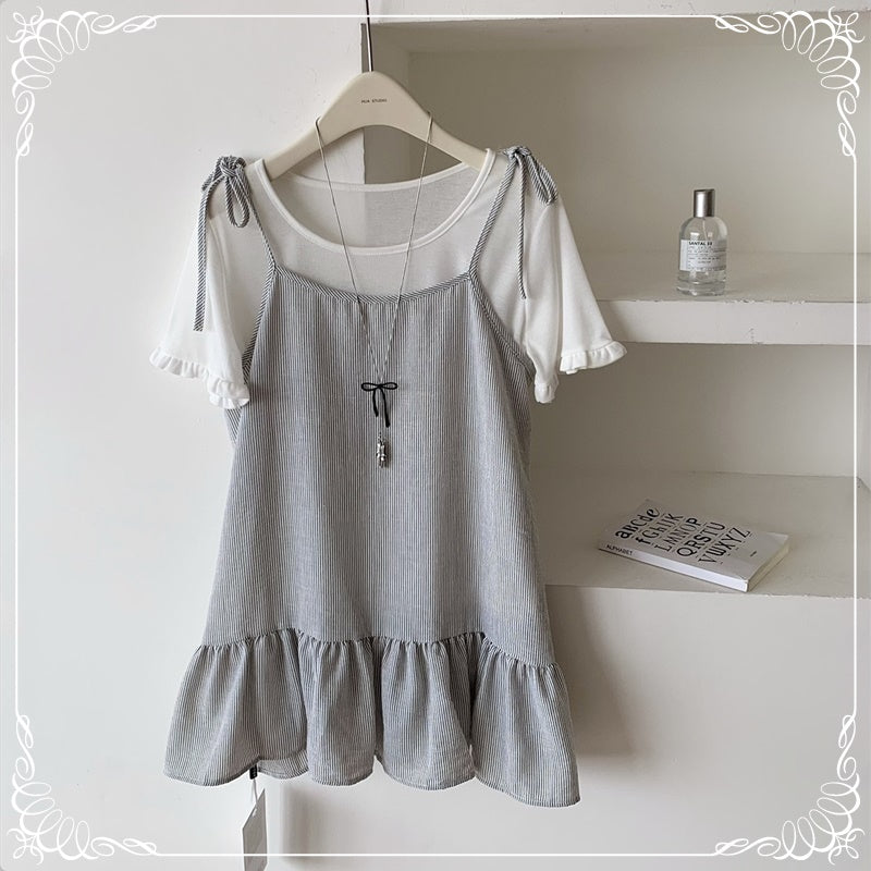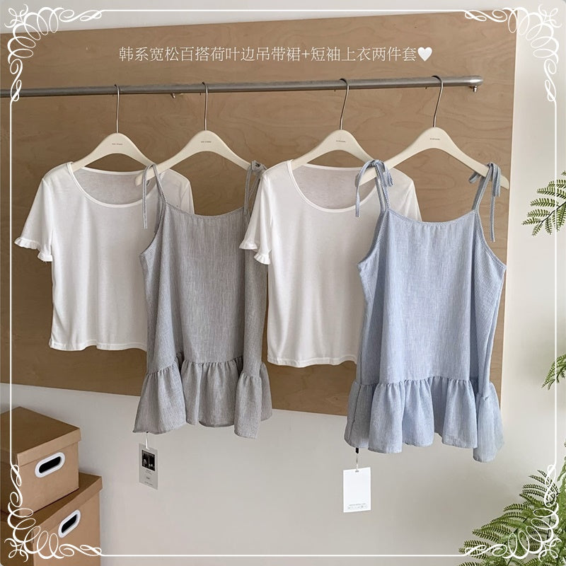 条纹 压褶 吊带连衣裙+T恤 两件套