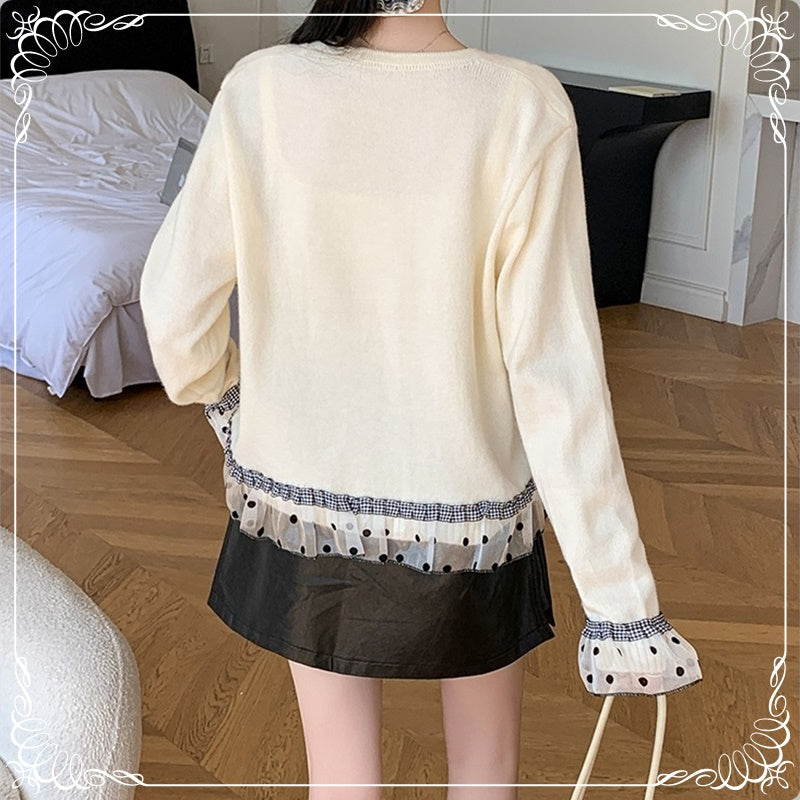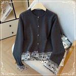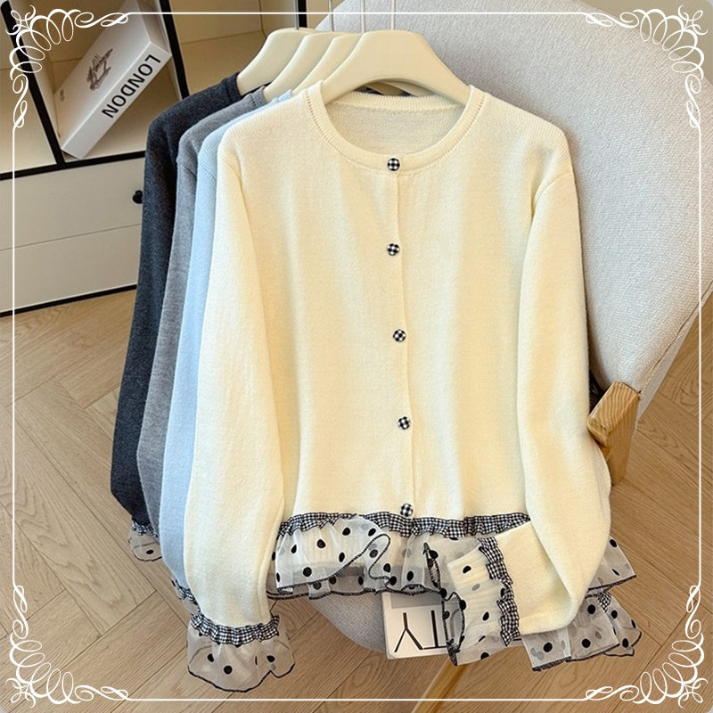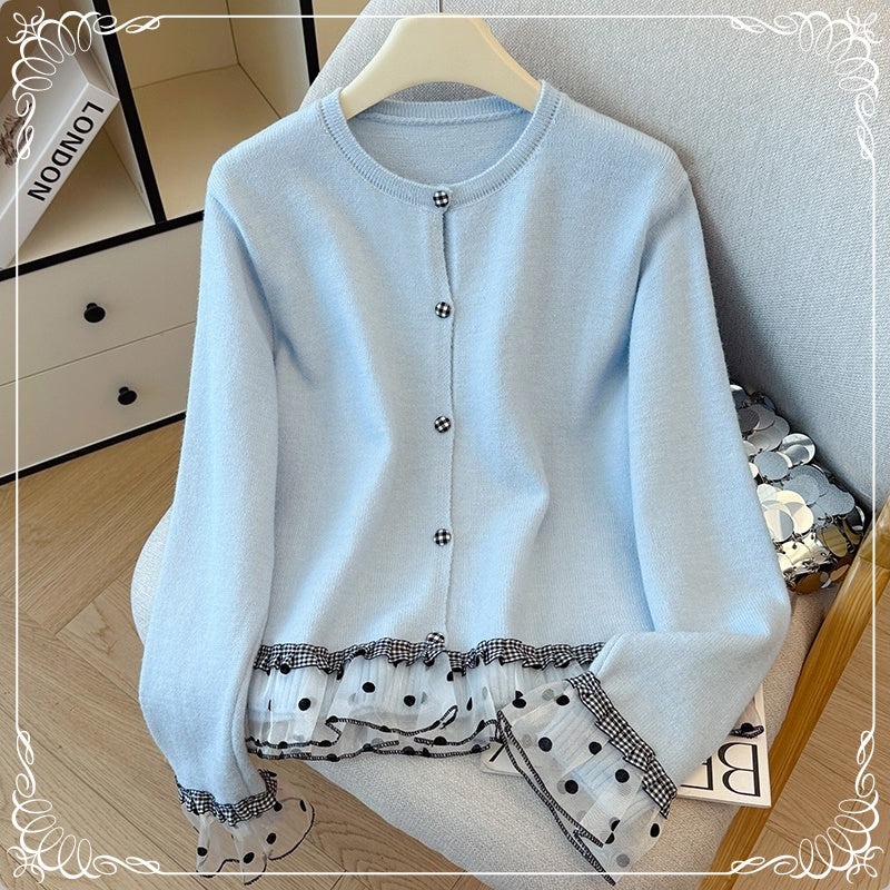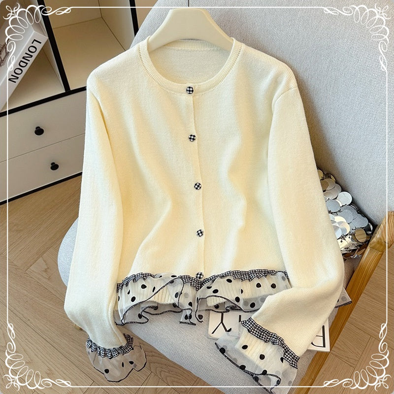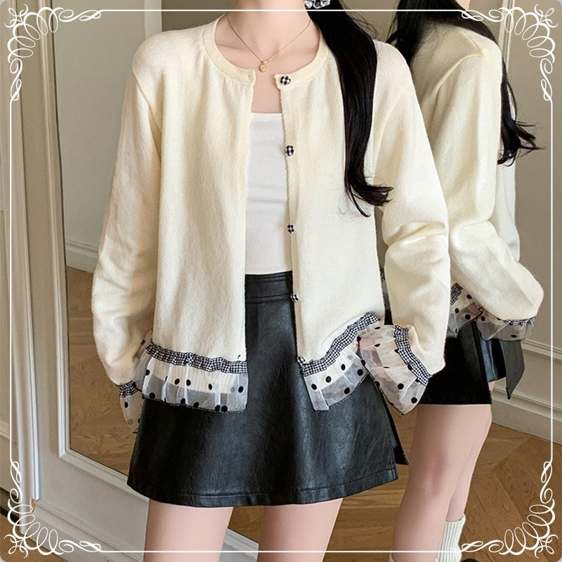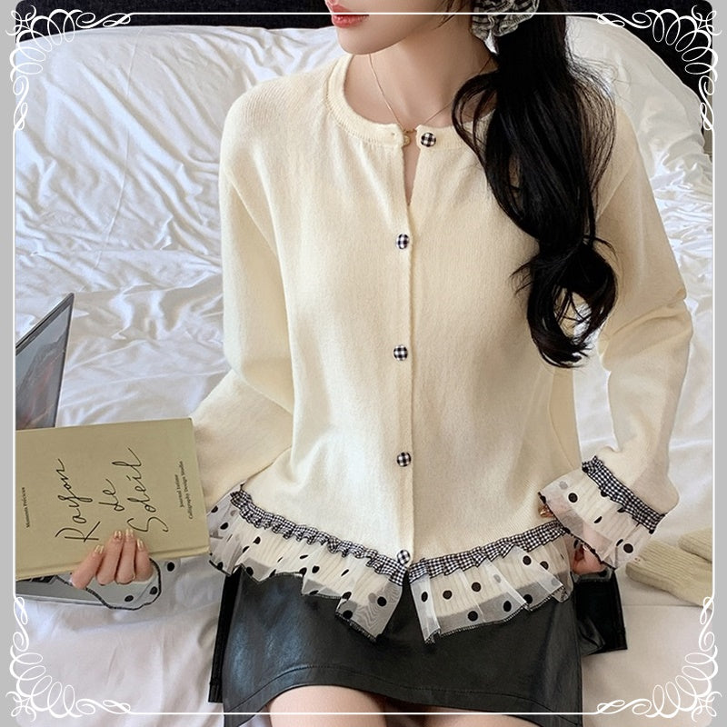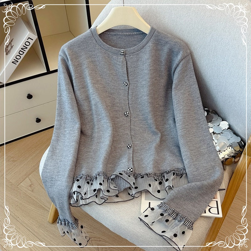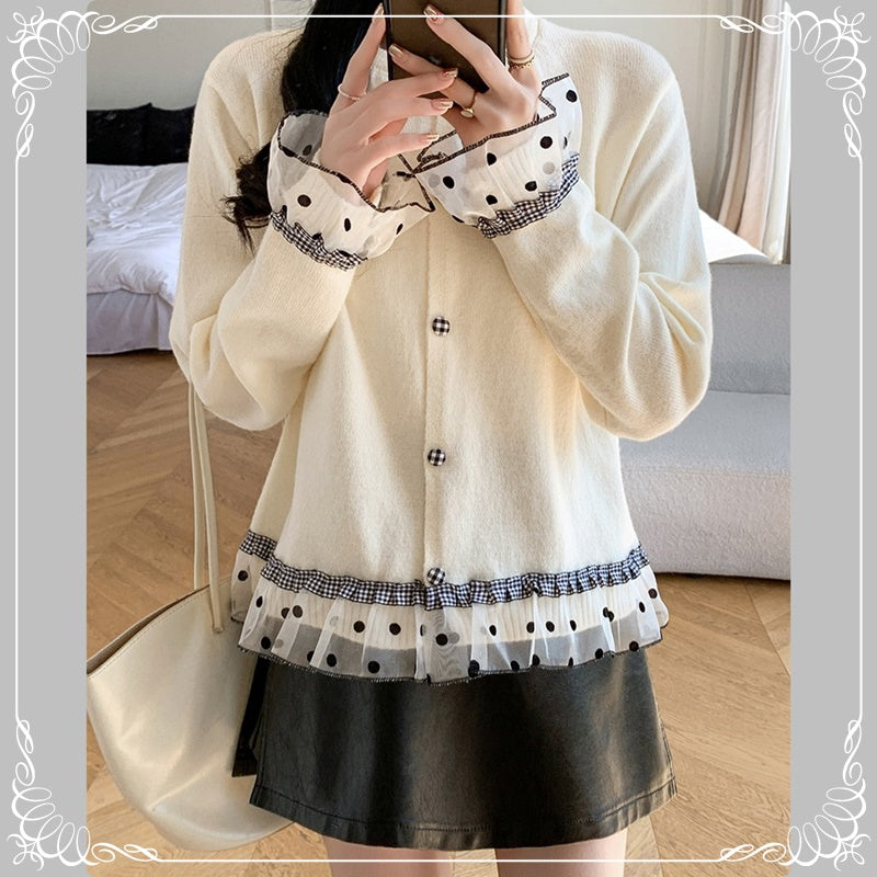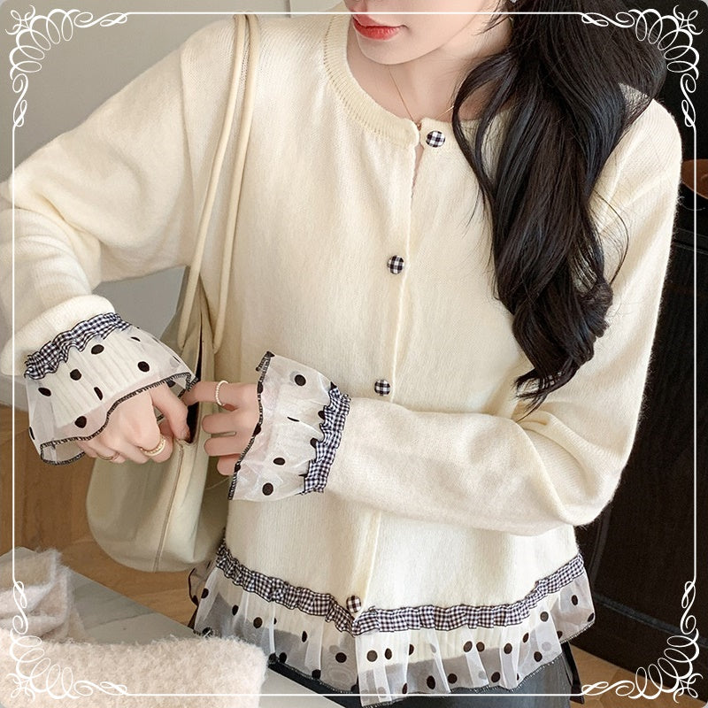 波点 格子 木耳边 拼接 开衫
