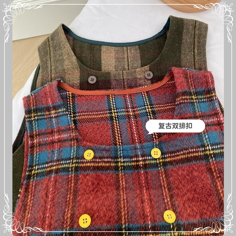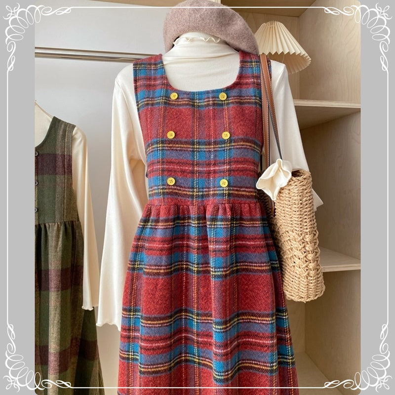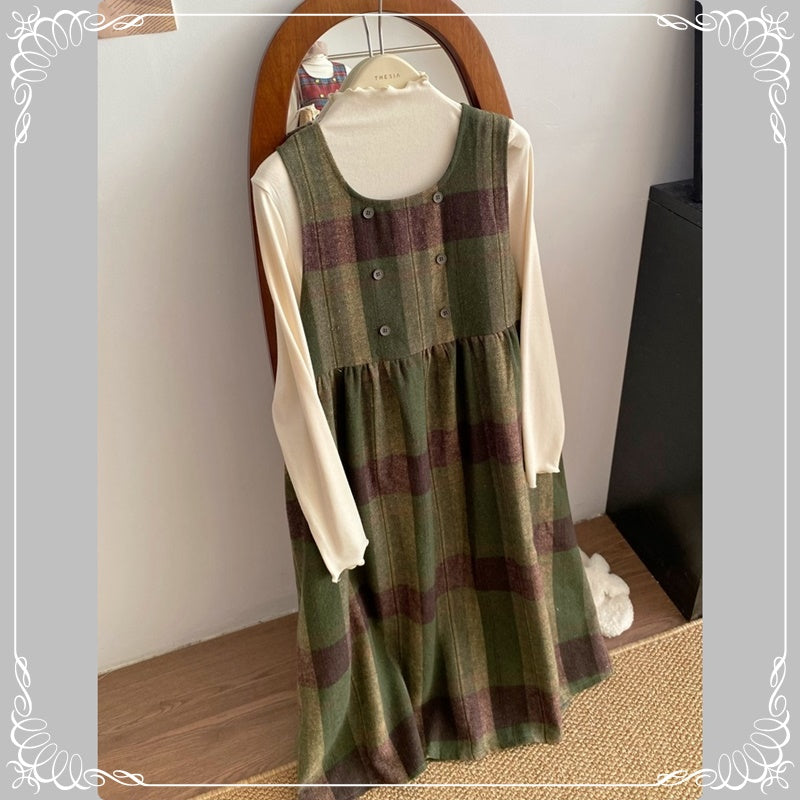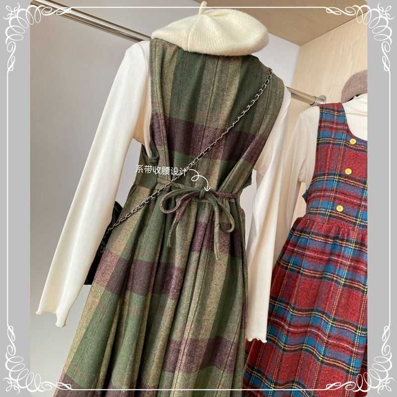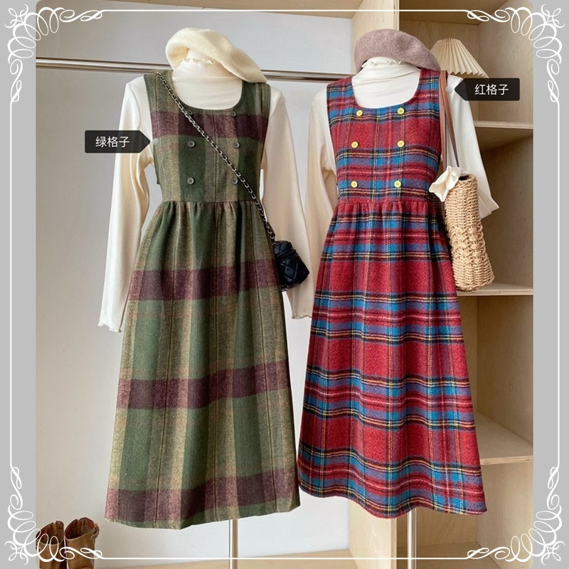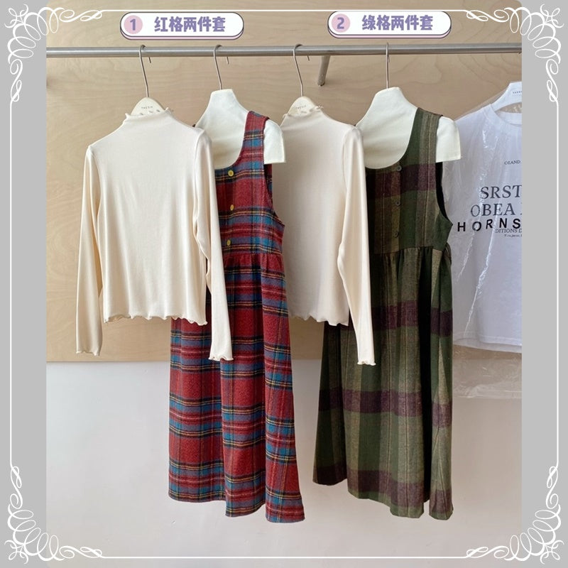 格纹 背带裙+高领花边打底衫 两件套套装