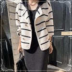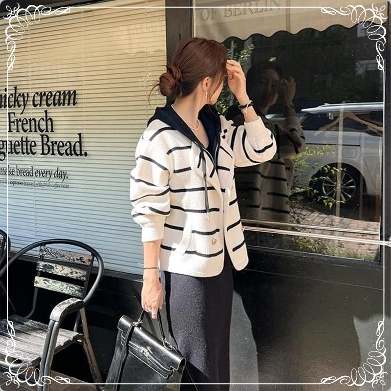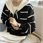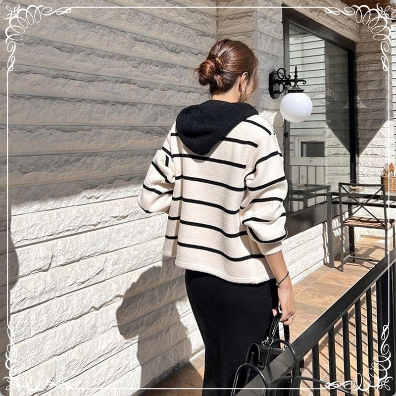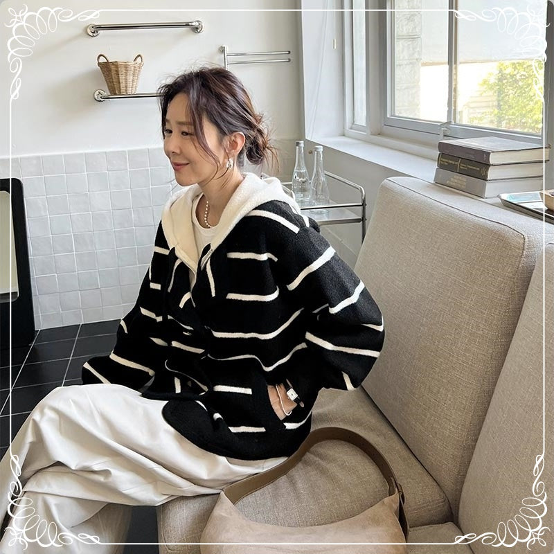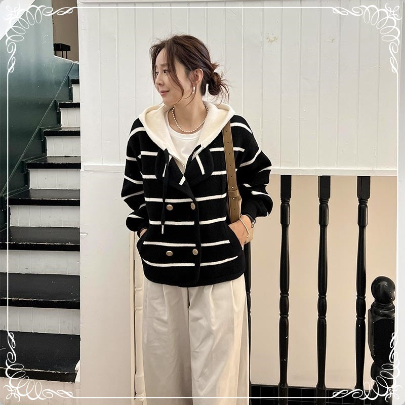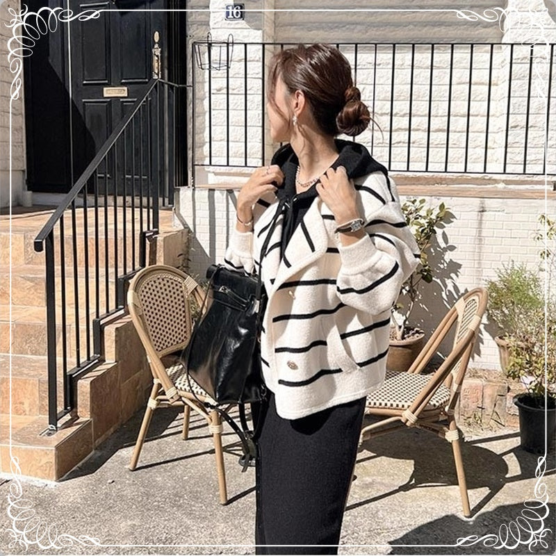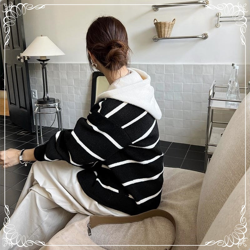 假两件 条纹 针织双面尼 连帽 外套