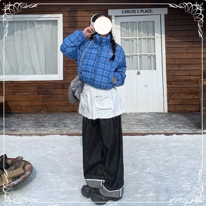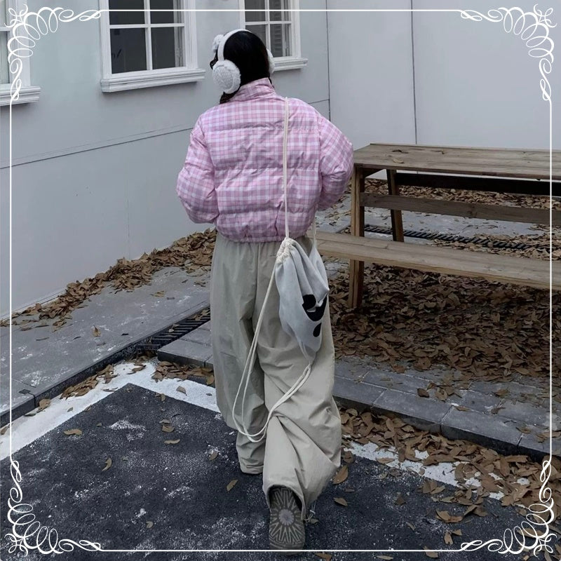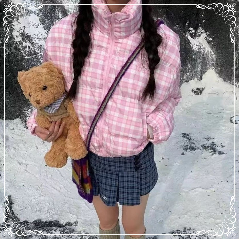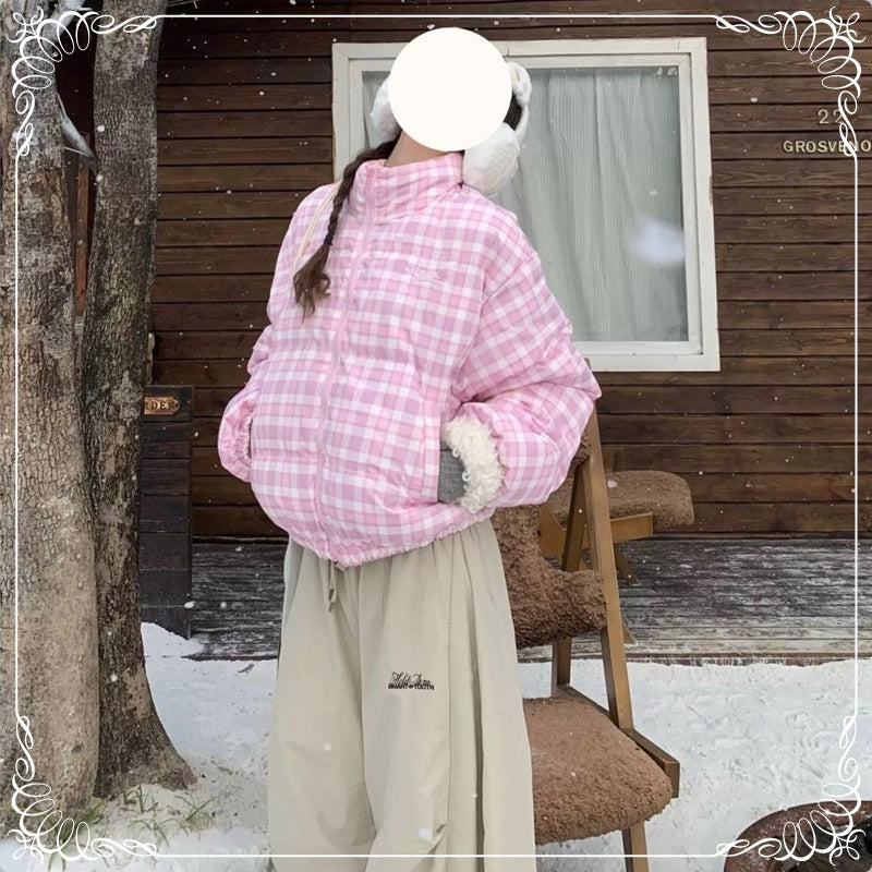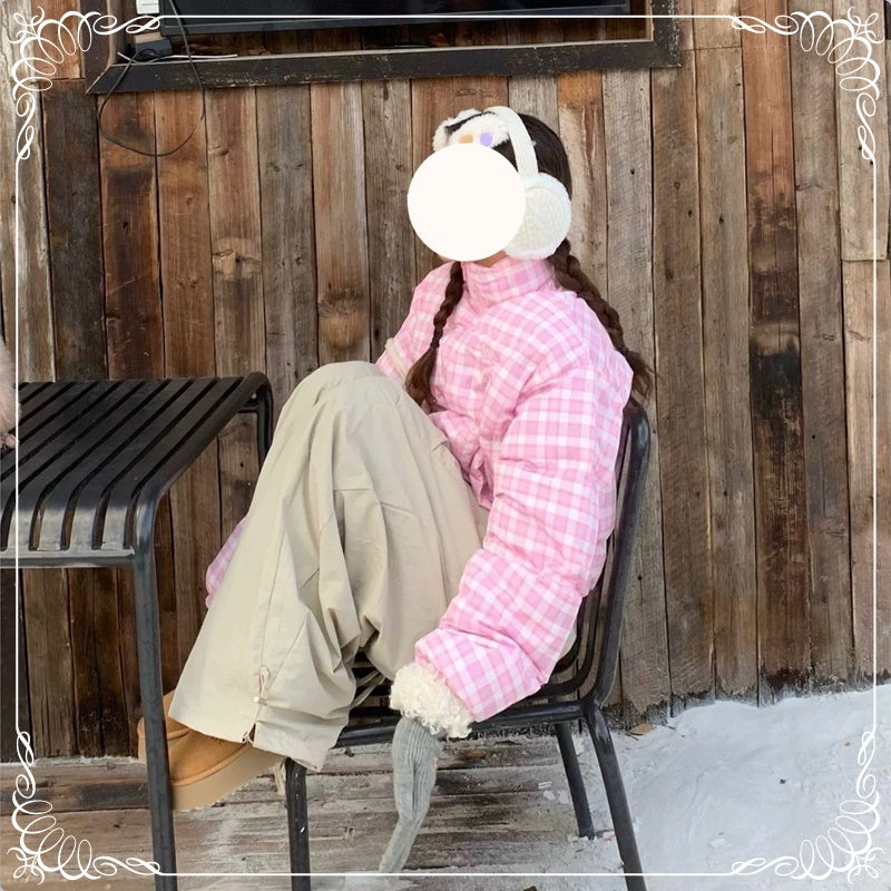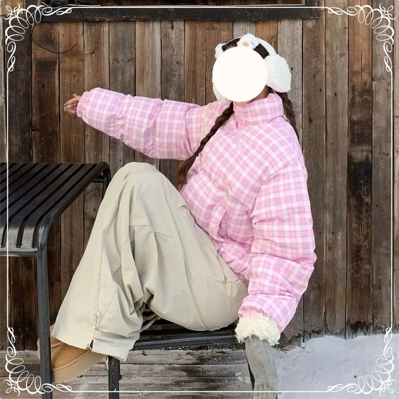 格子 立领 短款 面包服棉衣